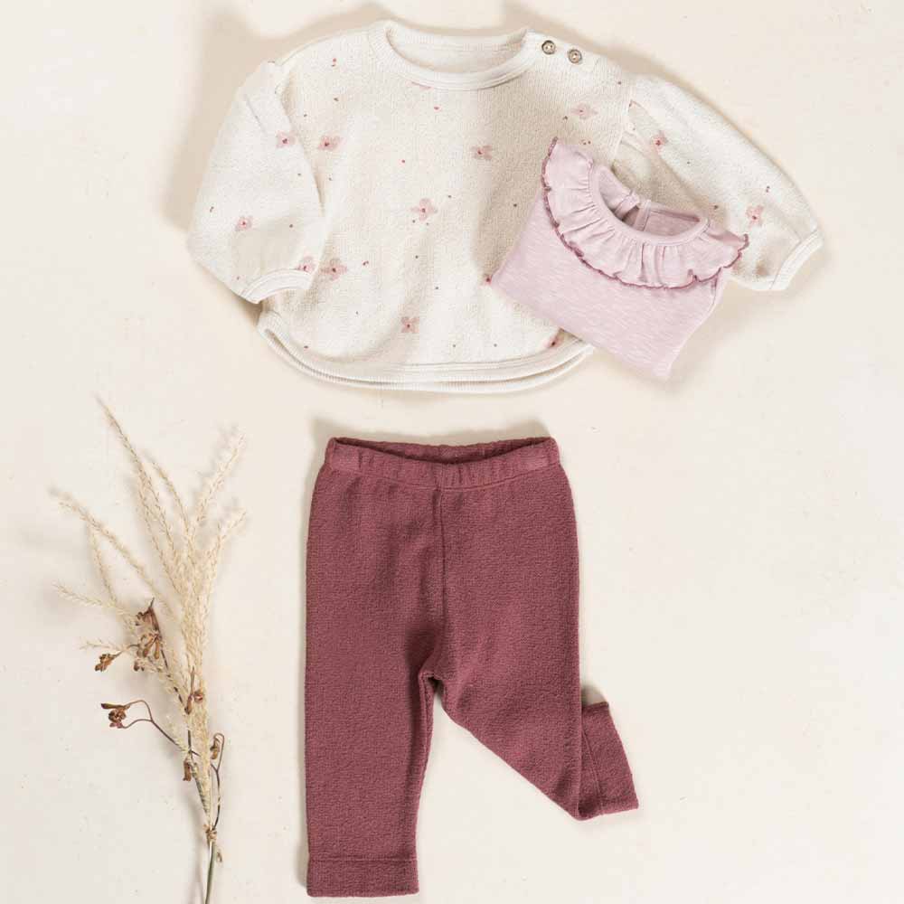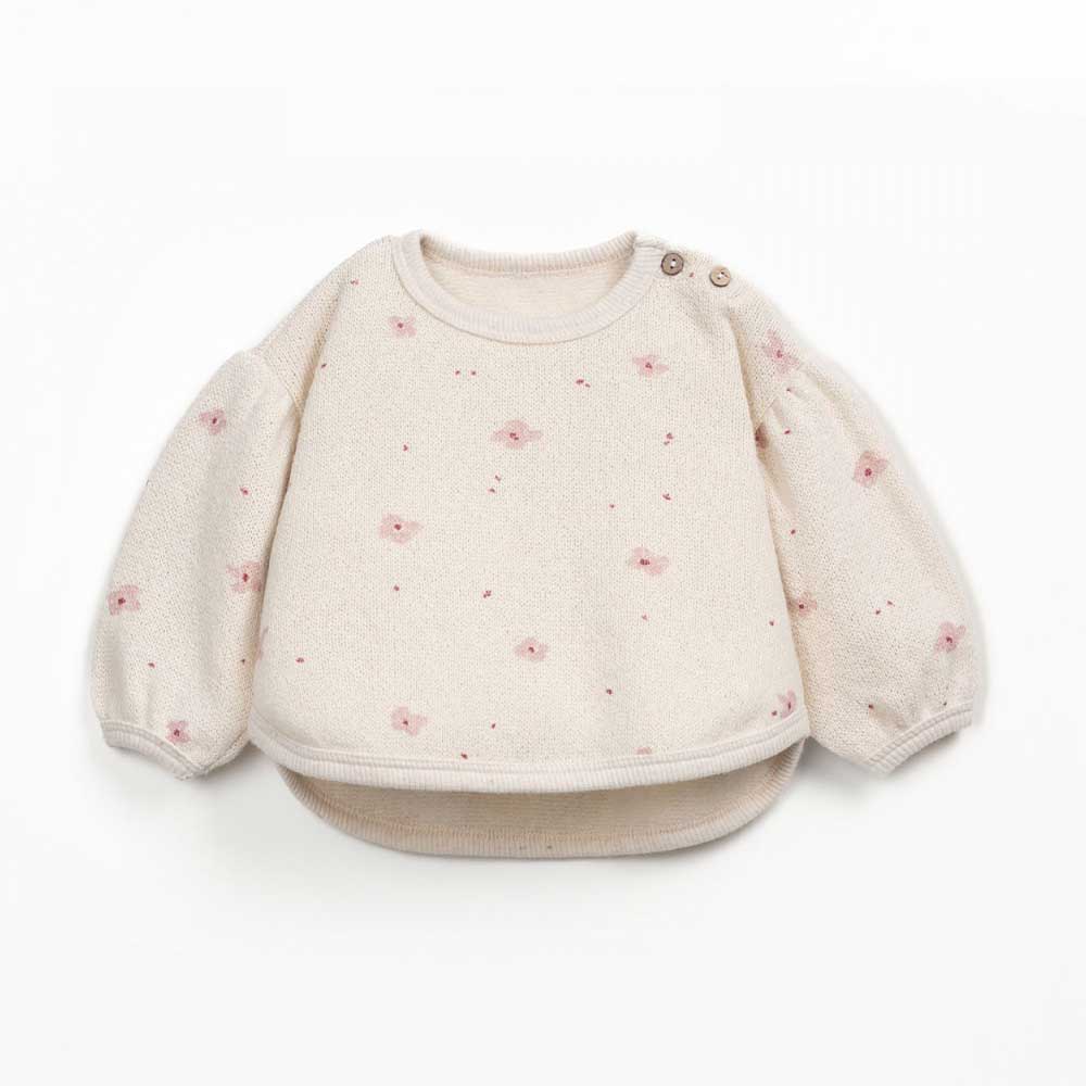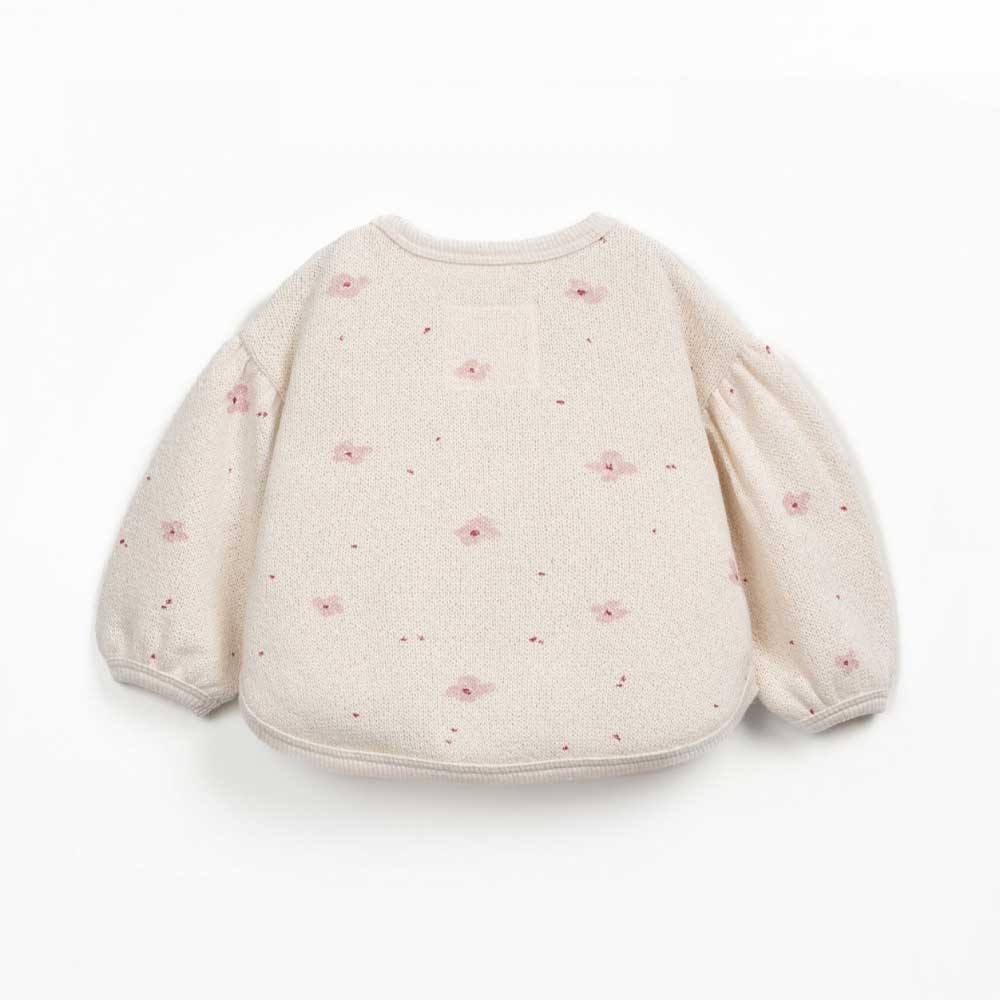 This sweatshirt is knitted with a blend of regenerative cotton and recycled cotton, in Blanco Roto color. It is a long-sleeved model, round neck, shoulder opening with two coconut buttons and our floral print.