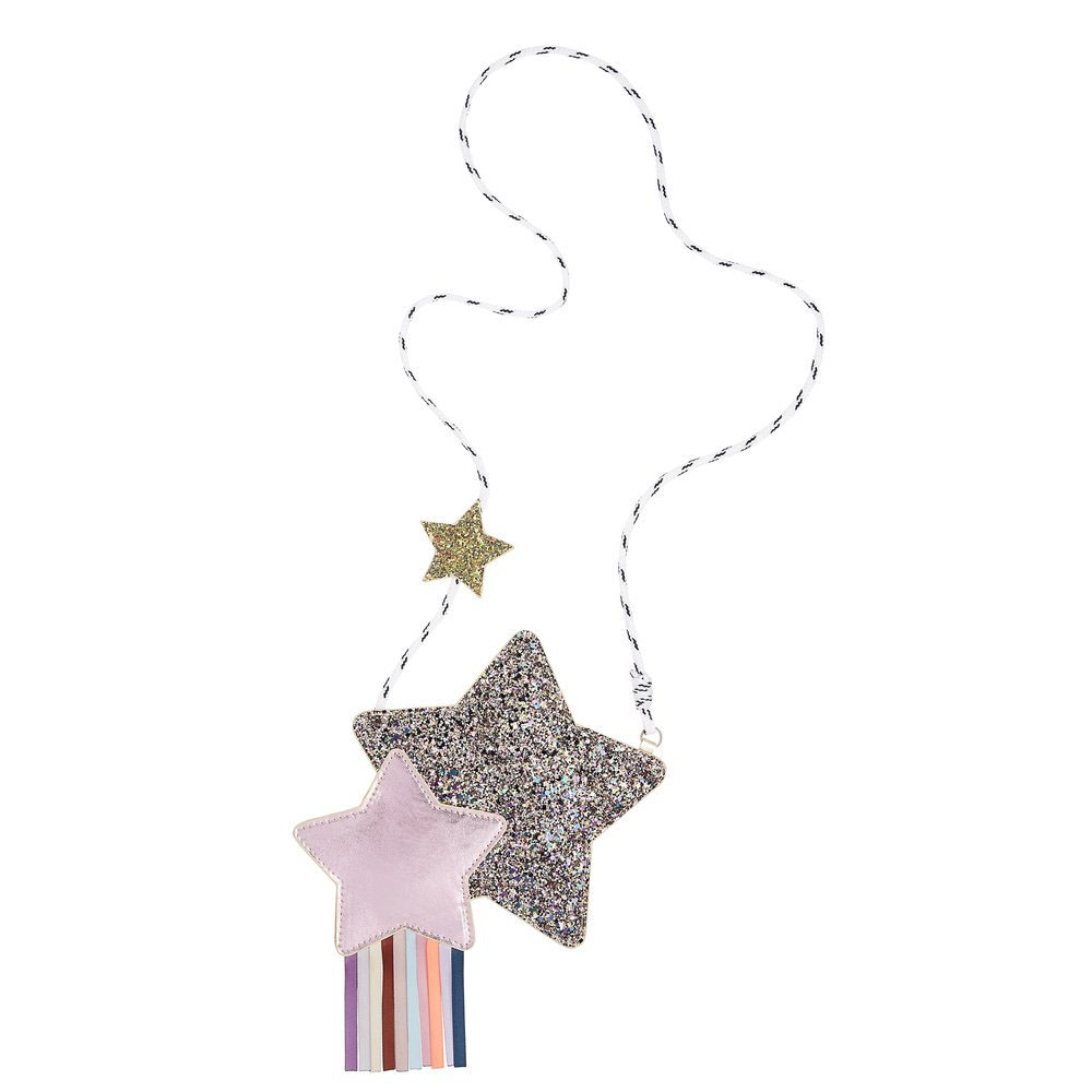 Make a wish in front of this shooting star! This sparkling shooting star bag is a key piece of the collection. With its shoulder strap to be worn as a shoulder strap decorated with a glittery star, this bag consists of a metallic pink star superimposed on a larger glittery star; Zip pocket on the back to hide tiny treasures. We fall for the multicolored ribbons of the shooting star. This bag can be worn for a party or to accessorize an everyday outfit.
