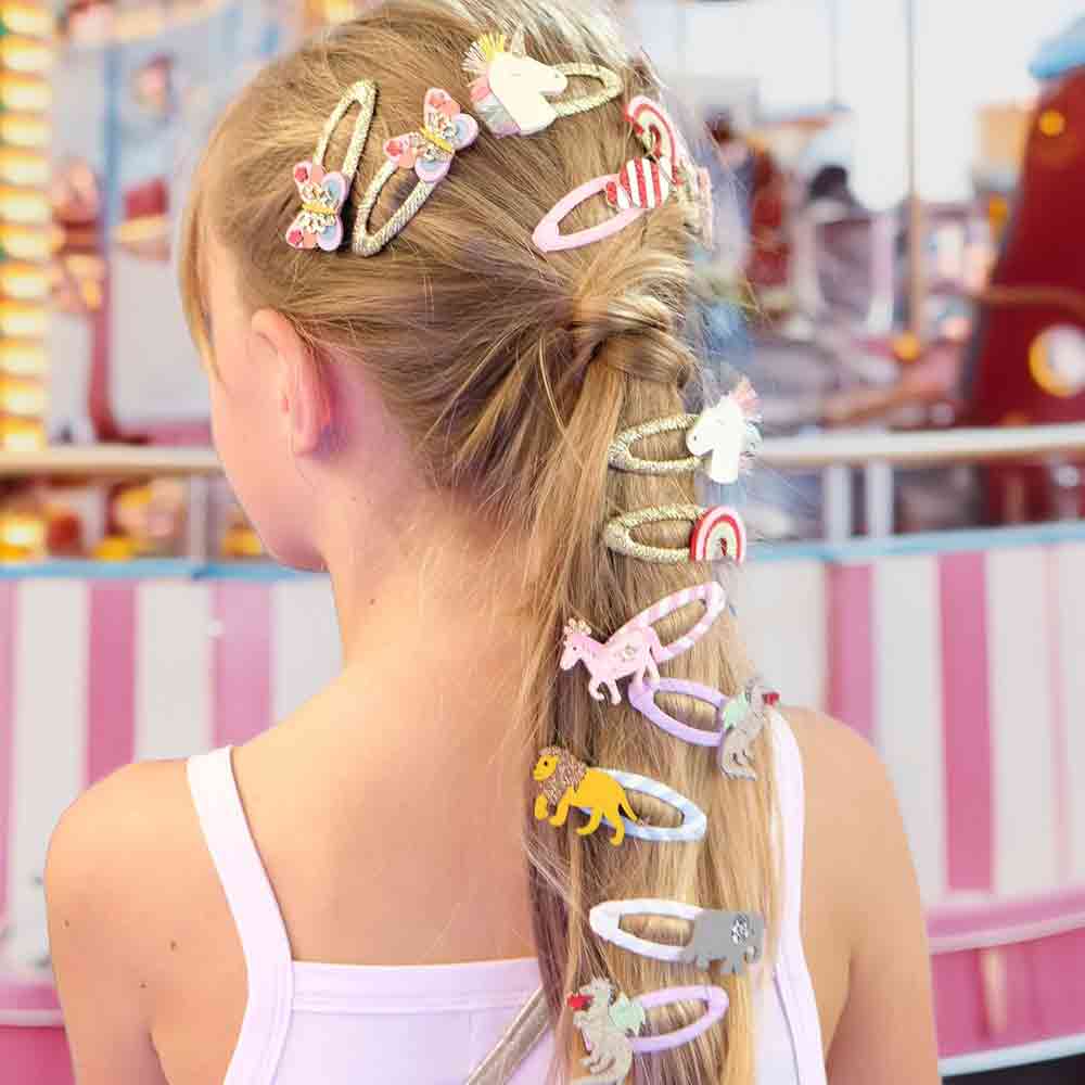 Put little hearts floating with these super fun carnival butterfly clips! Two delicate butterflies sit on snap clips wrapped in gold ribbon. Made with beautiful bright colors, they are the perfect companion for a fun summer carnival!