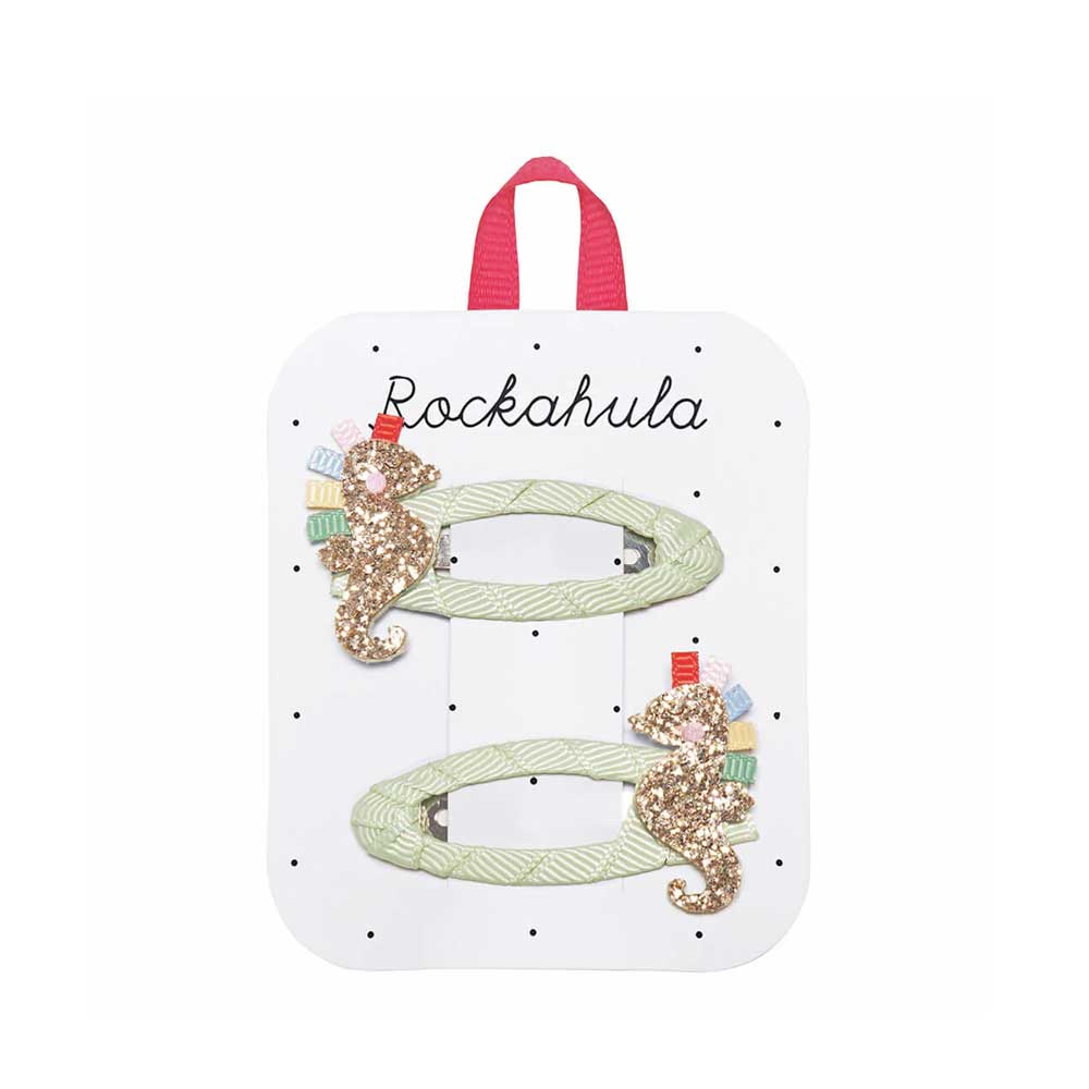 Our shimmering rainbow seahorse adorns this fun pair of instant clips! In shimmering gold glitter, each seahorse has rosy cheeks and a pretty rainbow ruffle and is attached to a clip wrapped in pale green grosgrain ribbon.