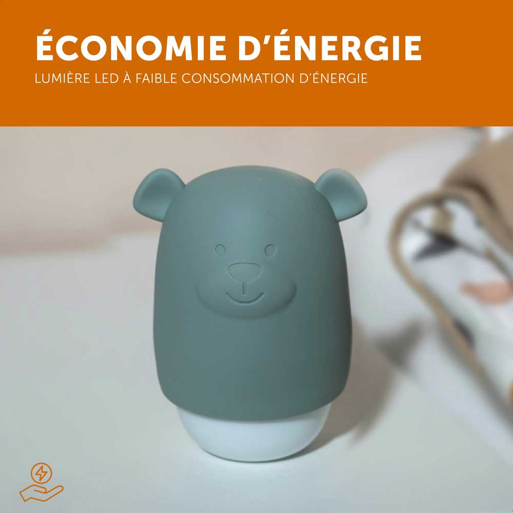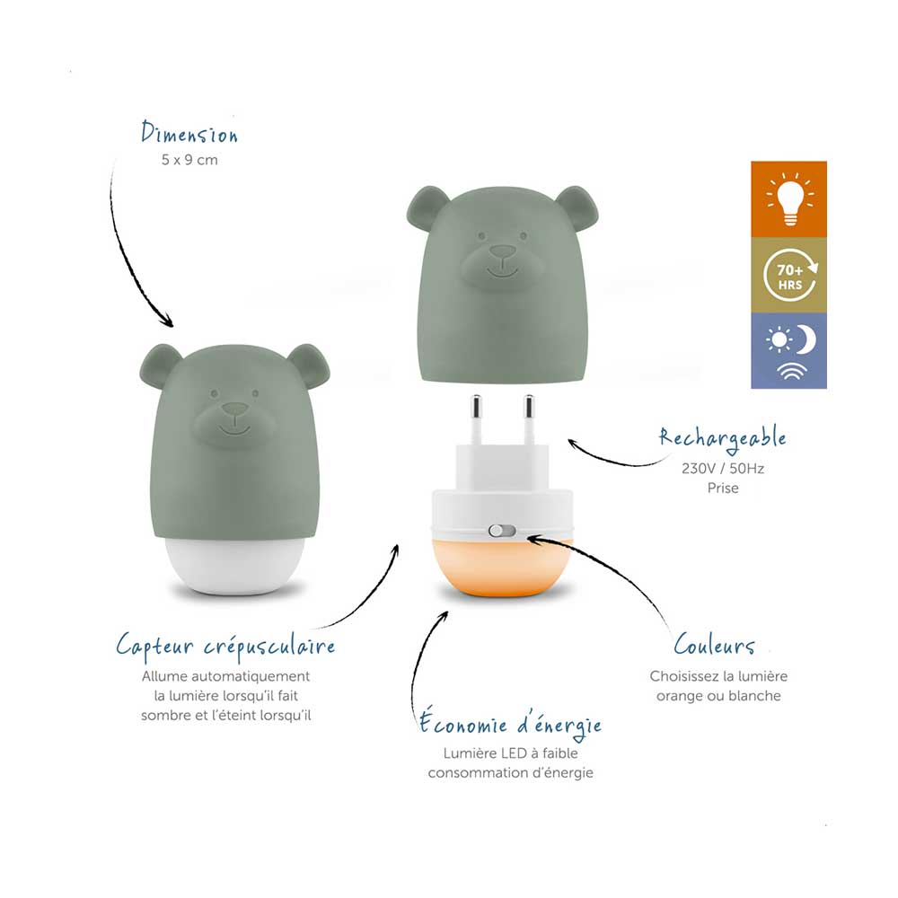 Compact and lightweight, it charges directly from a wall outlet: just remove its cap and plug it in. Its generous battery life (70 hours and +) makes it a reliable companion for all nights. A simple, safe and practical night light, ideal from 10 months.