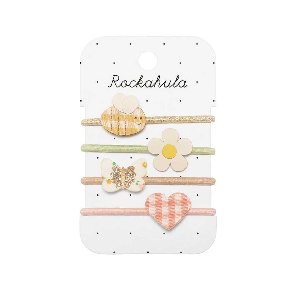 Beryl Bee And Butterfly Elastic Set from Rockahula Kids. This pack of four mixed ponies is perfect for spring afternoons in the garden! With a yellow gingham, the Beryl Bee buzz, a floating butterfly, a soft daisy and a pink gingham love heart. Perfect for all spring garden adventures!