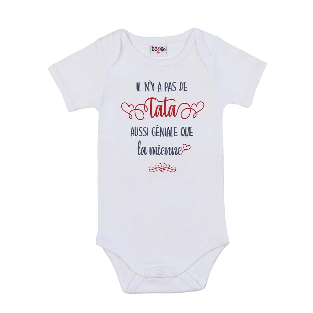 There’s no auntie as great as mine For absolutely adorable babies, this pure cotton bodysuit has a message full of humor and tenderness. Short sleeves, American armholes. Snaps at the crotch. An ideal birth gift!