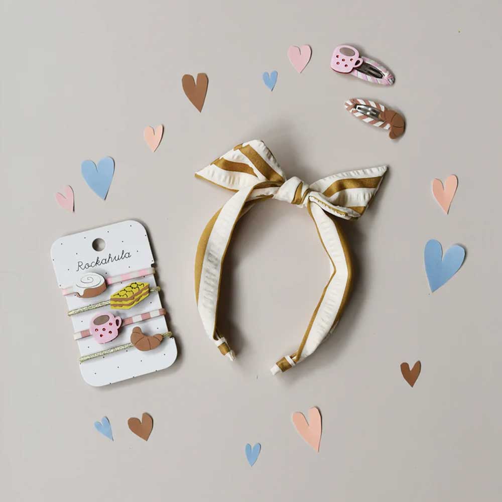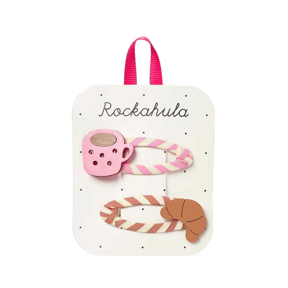 Start your morning with a little breakfast magic! This adorable clip set includes a pink coffee cup and a golden croissant. The two were sitting on snap clips wrapped in striped ribbon, they are the perfect accessory for breakfast or brunch!