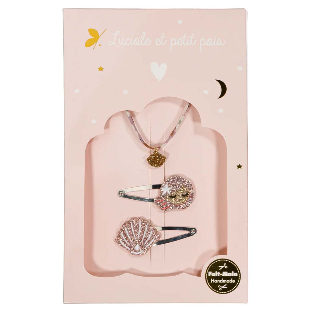Ce coffret associe les barrettes Pearly (sirène et coquillage) à un magnifique bracelet Liberty Mitsi Glycine et son coquillage doré. Un ensemble enchanté pour les reines de l’océan !