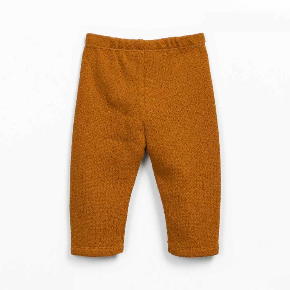 These leggings are made of knit with a blend of regenerating cotton and recycled cotton, in orange. It is a model with an elastic waistband and a decorative coconut button.