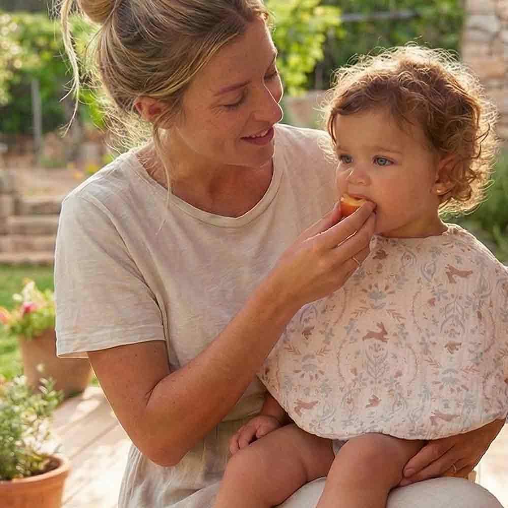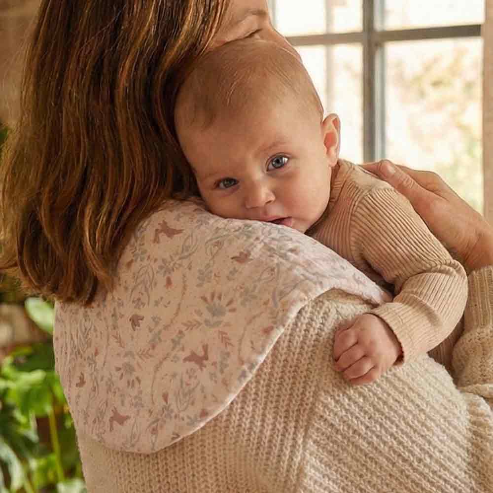 Practical and clever, this 2-in-1 bib can be used as a poncho for baby as well as a shoulder protector for the parent. Its ergonomic shape perfectly covers clothes during meals or breastfeeding and then rests on the shoulder. Made of double cotton gauze and soft bamboo terry, it combines comfort, style and ease of care. Adjustable with snap buttons.