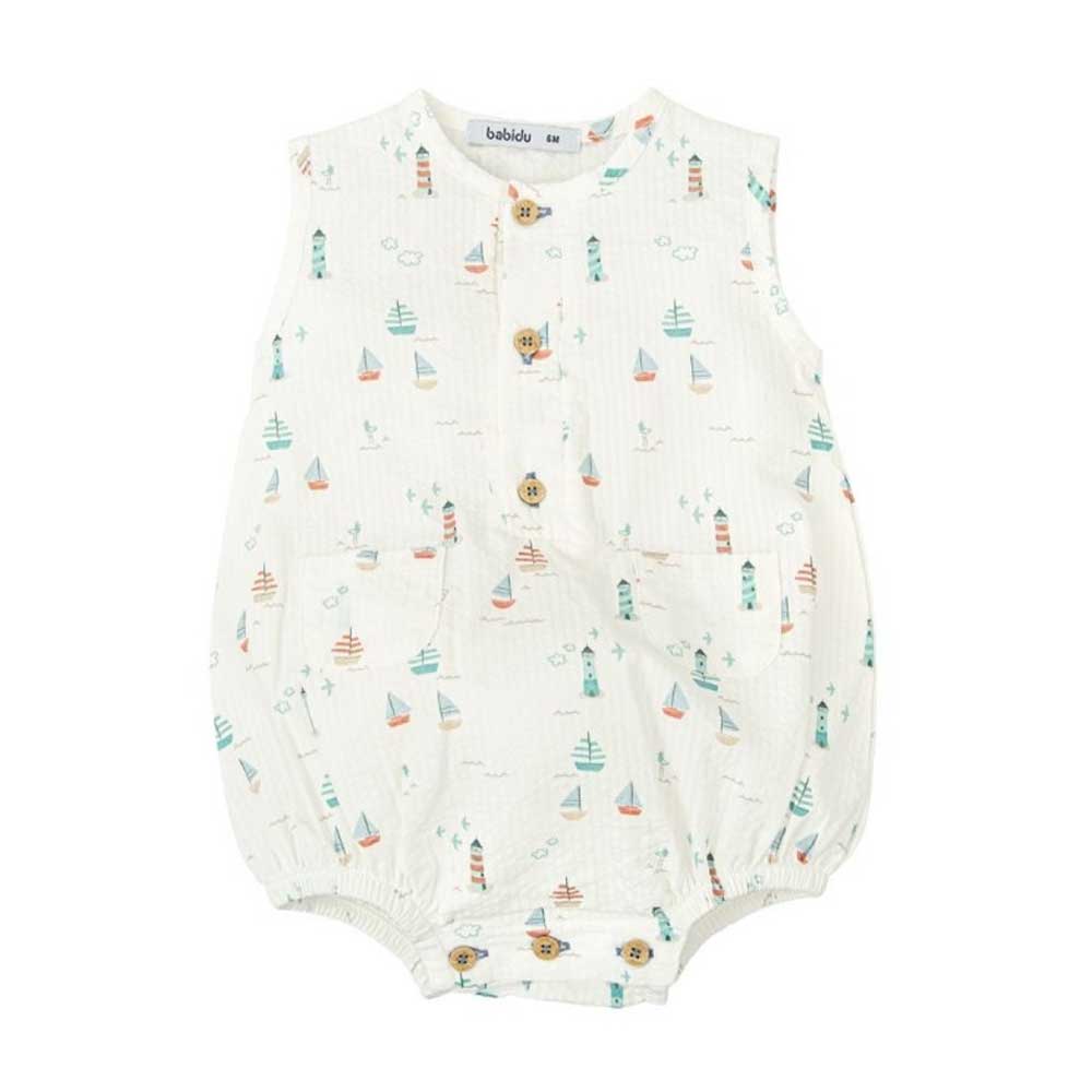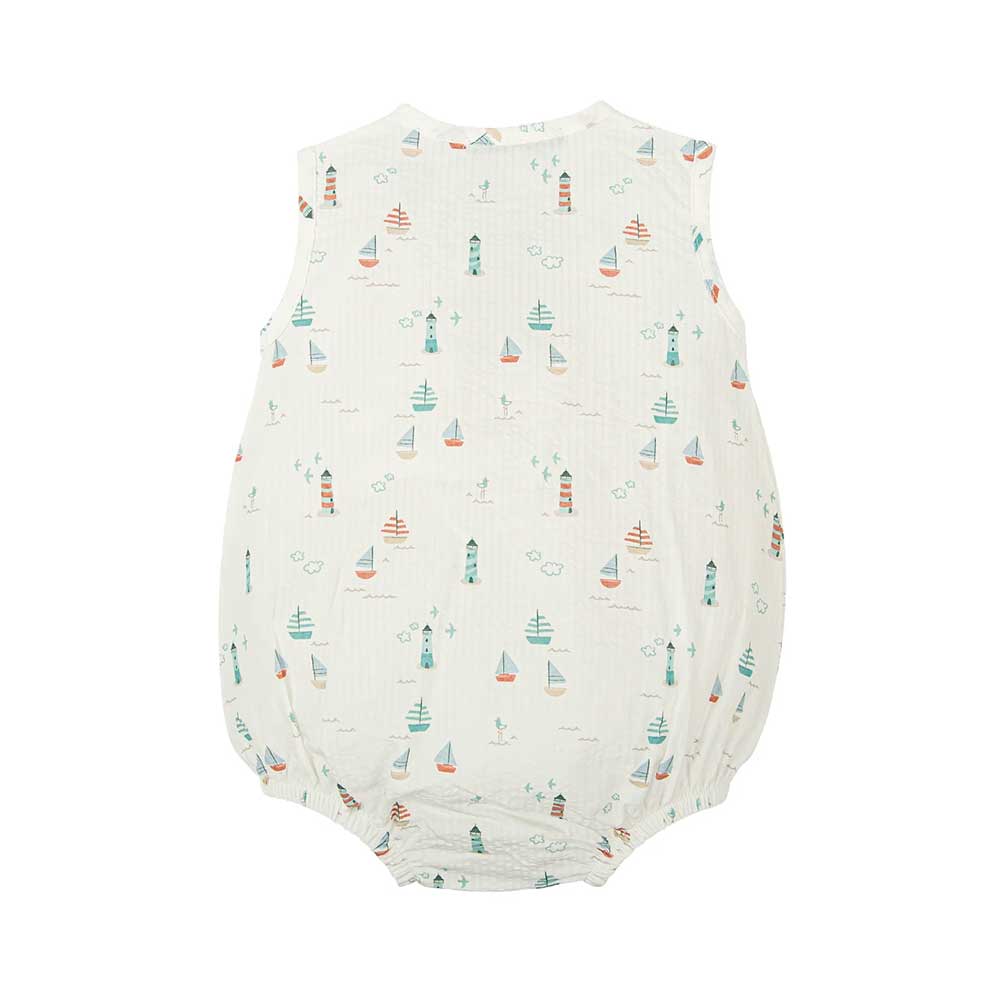 Unisex romper made of 100% woven cotton, designed to provide comfort, coolness and freedom of movement throughout the day. Its delicate nautical-inspired print and sleeveless design make it ideal for warmer weather.
