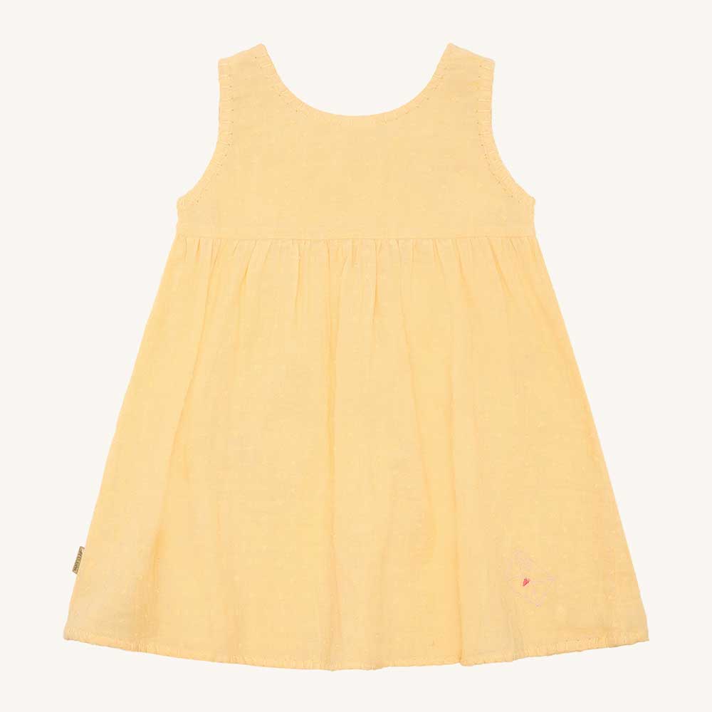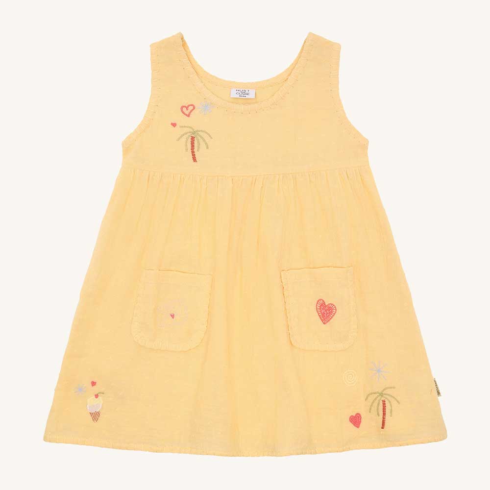 Robe d’été fille sans manches en tissu de coton léger avec des détails de broderie amusants. La robe a 2 poches à l’avant.