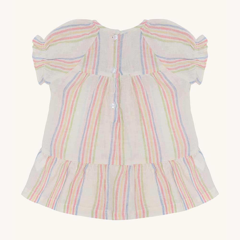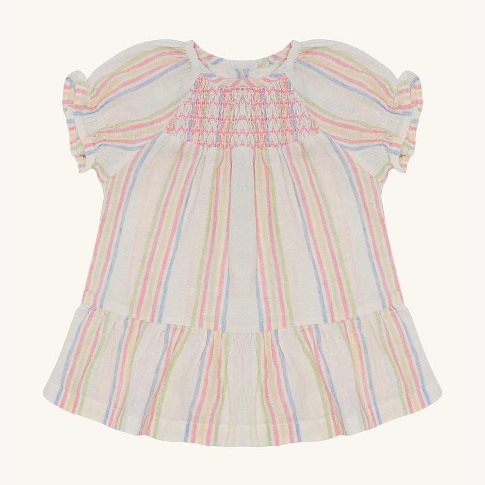 La robe bébé de Hust & Claire a des manches courtes avec un empiècement élastiqué aux épaules, créant un effet bouffant. La robe est ornée de volants. Elle se ferme à l’arrière à l’aide de boutons. Elle est charmante avec un motif à rayures dans des tons doux de rose, vert, jaune et bleu. La robe présente aussi un petit volant au niveau de la poitrine.