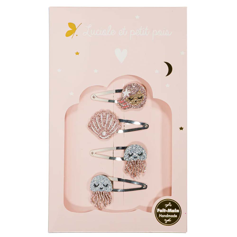 This Ocean Love set offers mermaid Pearly and Lulu jellyfish barrettes for magical and magical hairstyles. The essential accessory for queens of the sea.