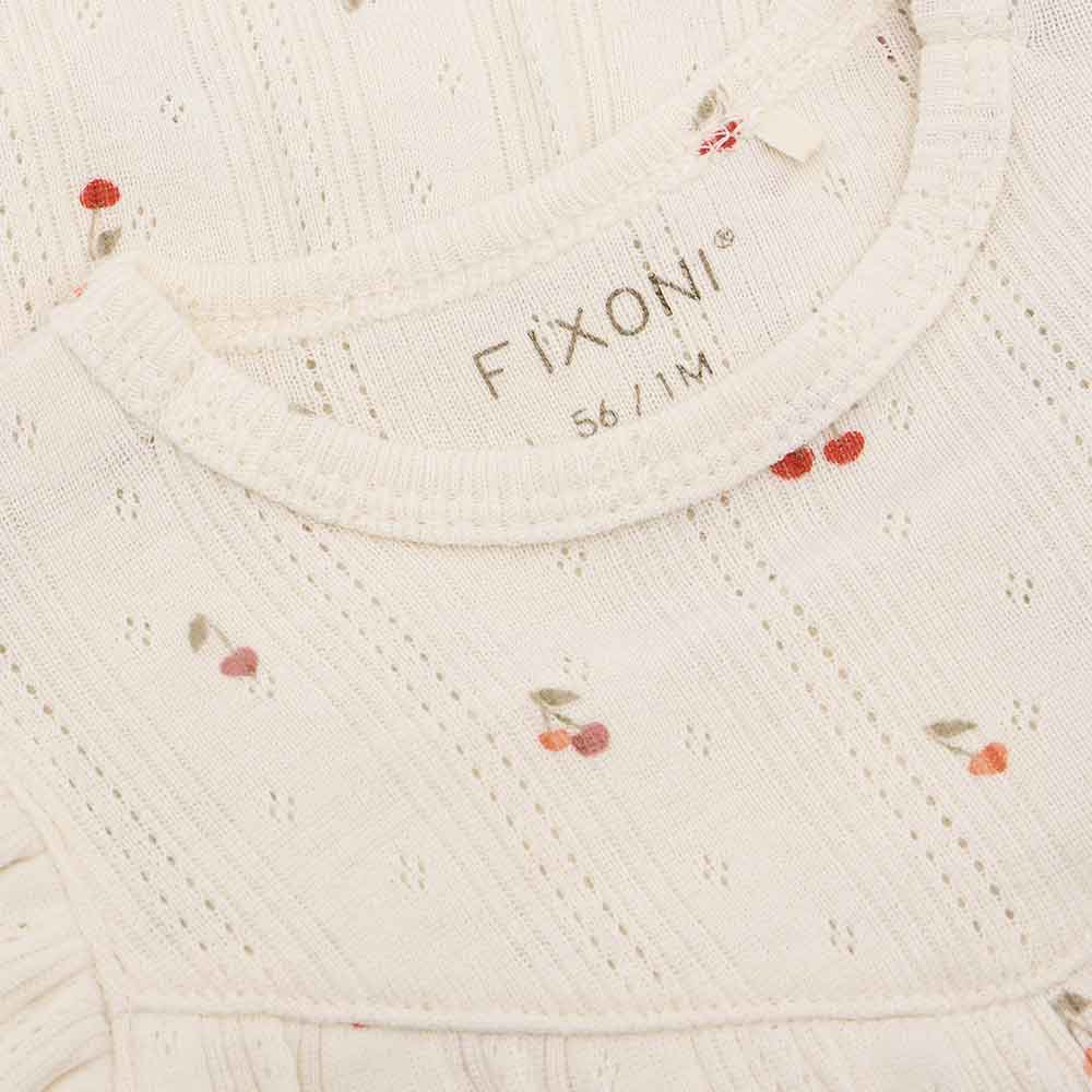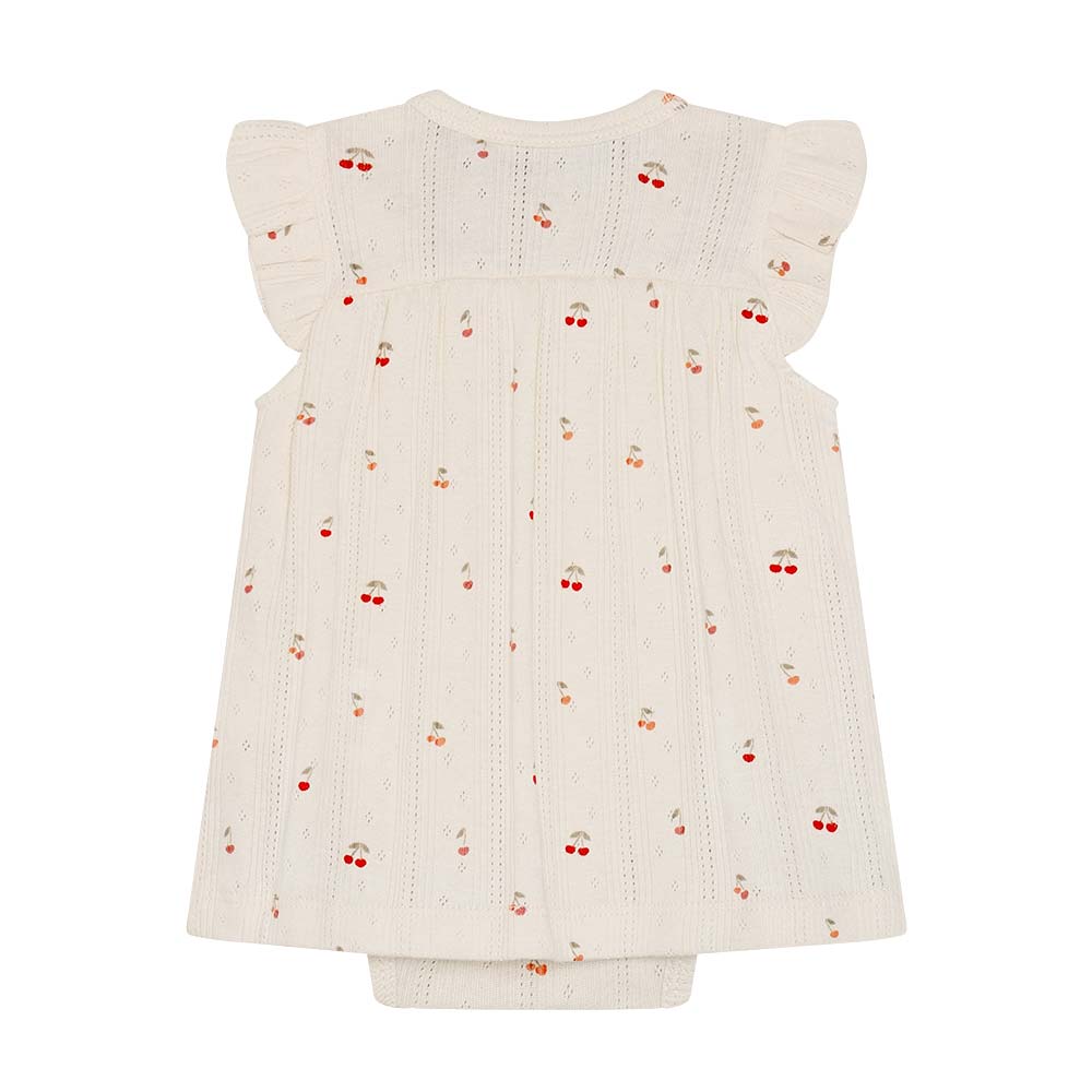 Pretty Fixoni bodysuit dress with a fine toe and a small cherry print. The body of the dress has a round neckline and short ruffled sleeves. It has a fluffy skirt and it closes with snaps at the left shoulder and between the legs.