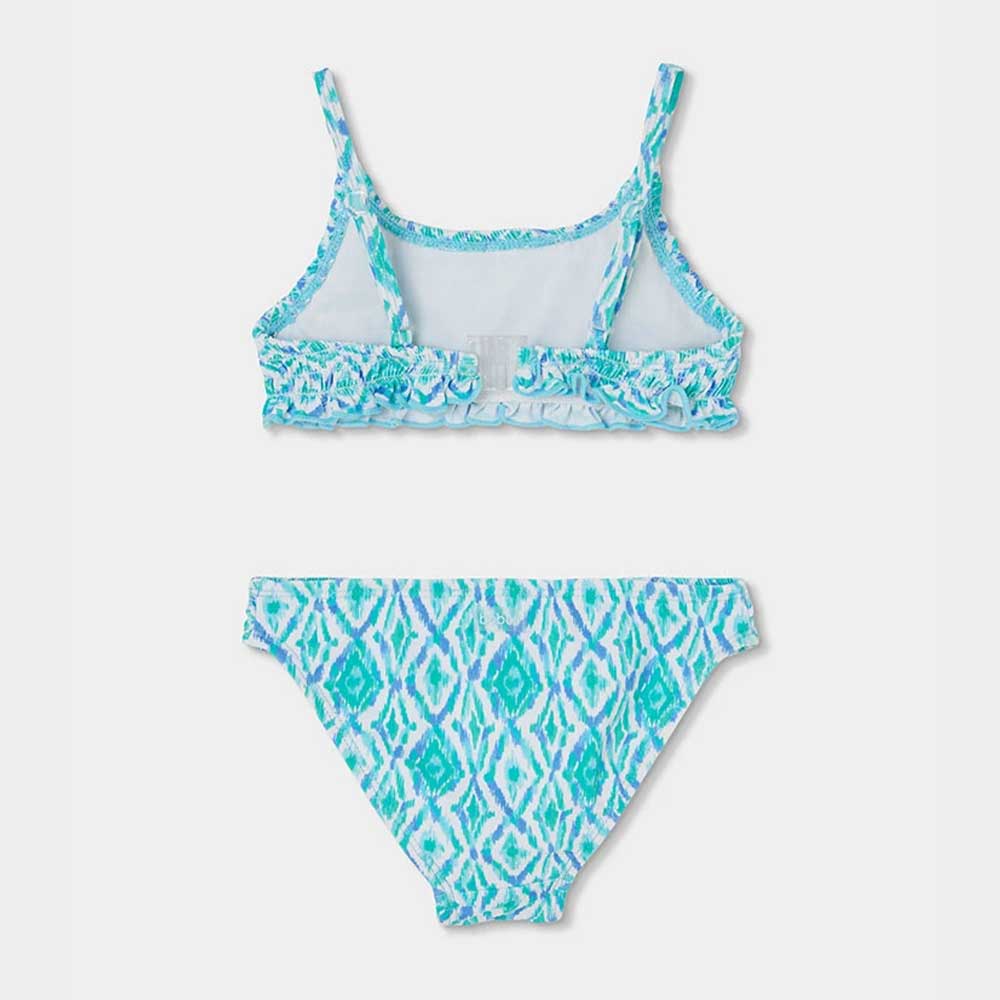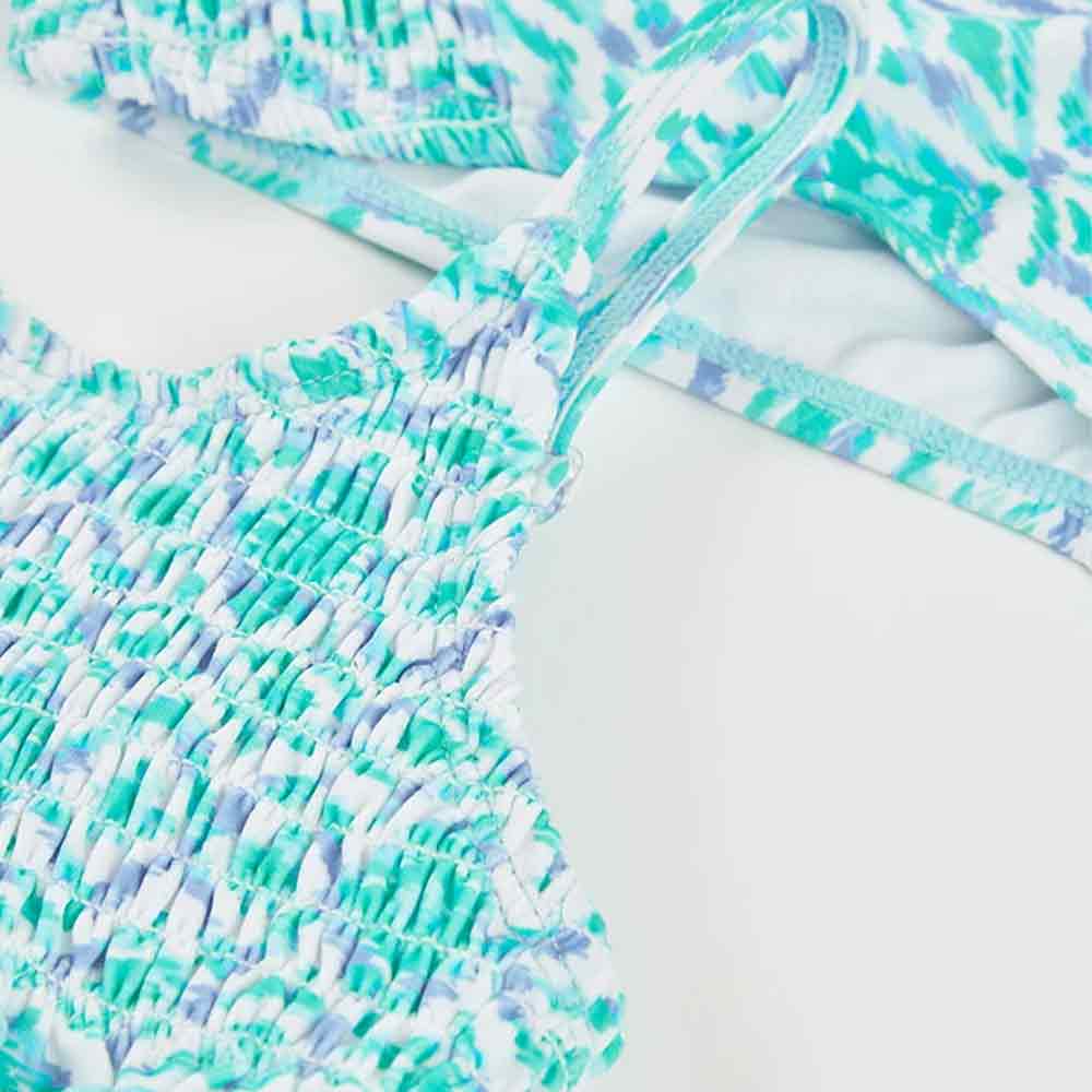 Printed bikini for girls, perfect for enjoying the summer. With a cheerful pattern in blue and green tones, it’s a fun and colorful option for the beach or pool. Made of stretch material with UPF50 sun protection, it offers comfort and freedom of movement.