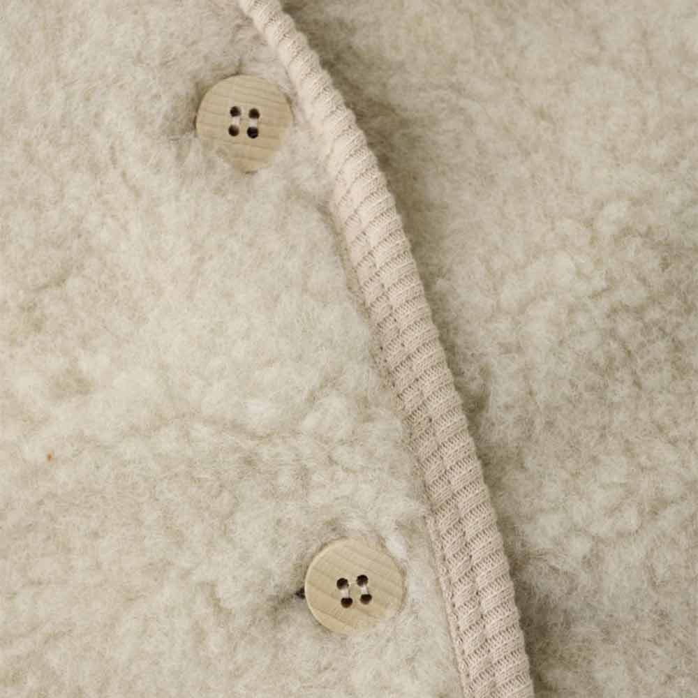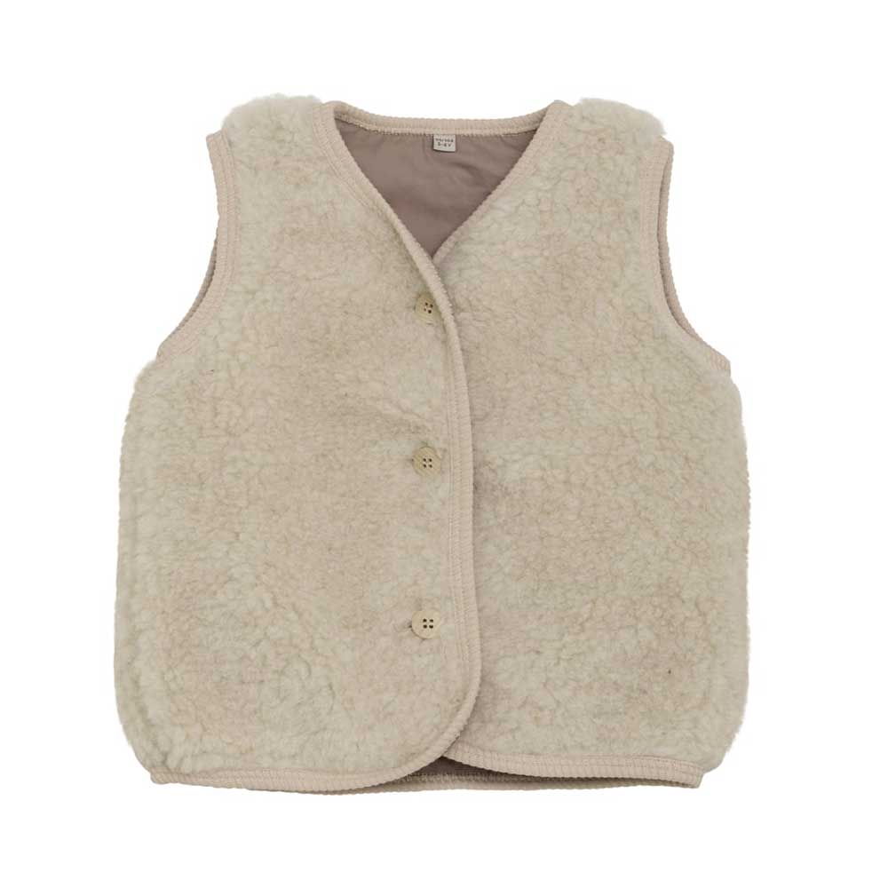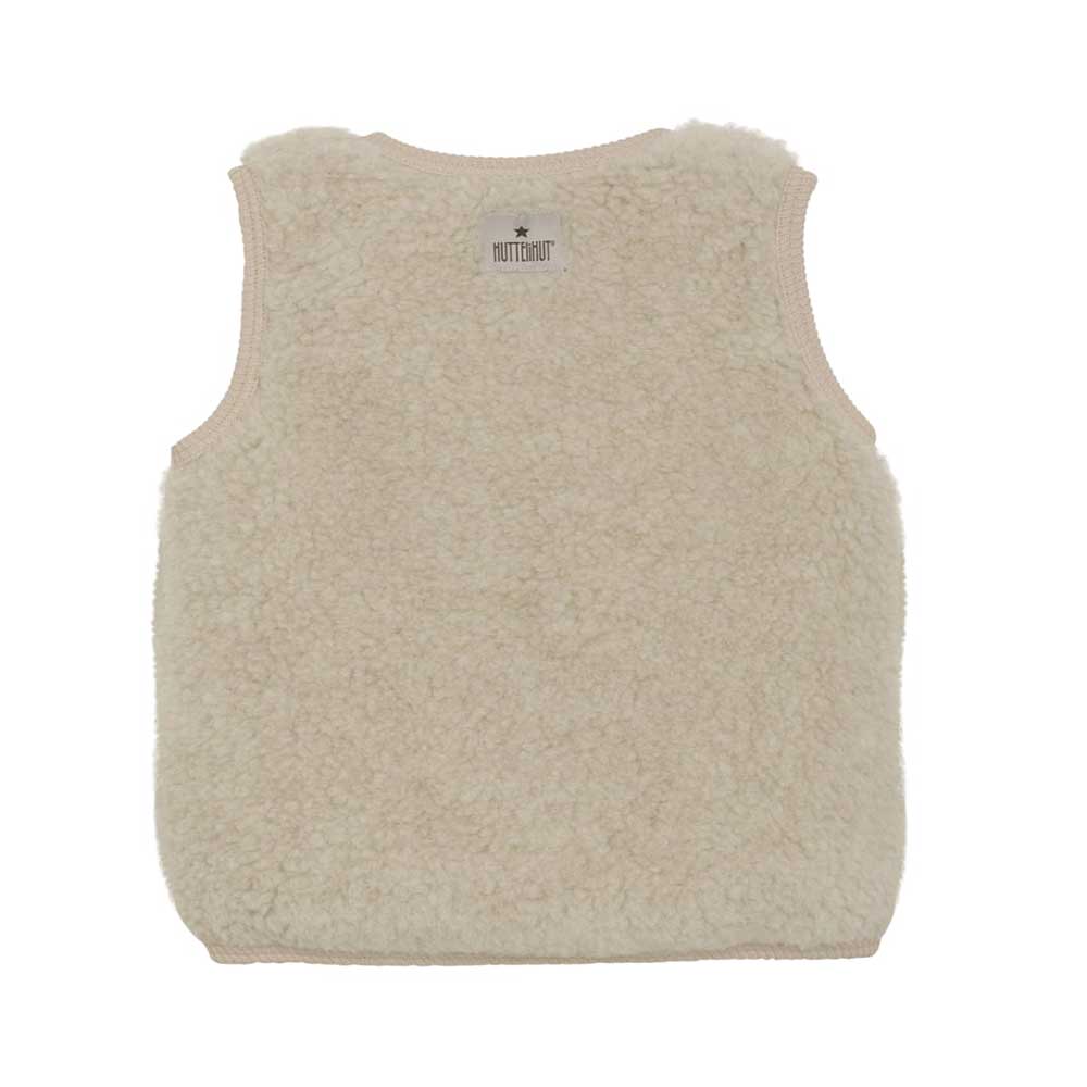 Adorable and warm plush vest from the Danish brand HUTTEliHUT, made of 100% merino wool, with a plush texture on the outside and a cotton lining. This cardigan has a nice buttoned V-neck at the front. Ideal to wear over a sweater for extra warmth.