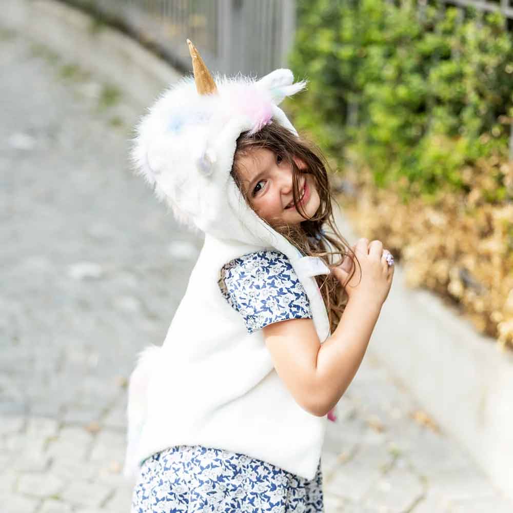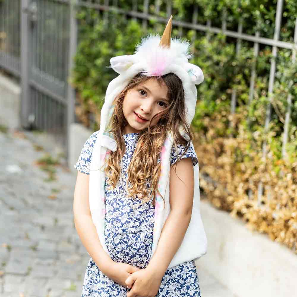 Bring a touch of magic to everyday adventures! Made from soft white fur, this enchanting vest features a shimmering golden unicorn horn, accented with pastel fur at its base for an extra dose of whimsy. Lined with a beautiful pastel gingham fabric, the vest offers both comfort and style, making it perfect for imaginative play or to add a magical flair to any outfit.
