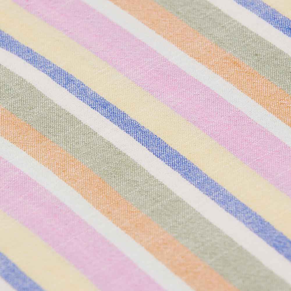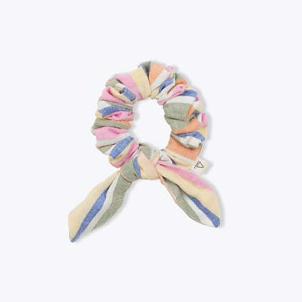 Chouchou à petit nœud à rayures multicolores, parfait pour apporter une touche joyeuse et colorée aux coiffures du quotidien. Confectionné en voile de coton rayé 100 % coton tissé, il est léger, doux et agréable à porter.