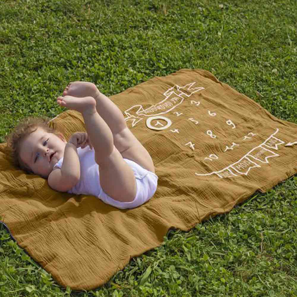 Composée de deux couches de double gaze de coton, la couverture offre deux utilisations : côté pile, c’est un joli plaid léger pour bébé, côté face, c’est un décor pour prendre bébé en photo à chaque étape de son développement ! Cette couverture est livrée avec deux accessoires en tissu (une flèche + un anneau) pour mettre en avant les informations adéquates au moment de la prise de vue.
