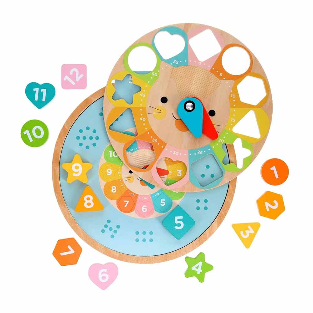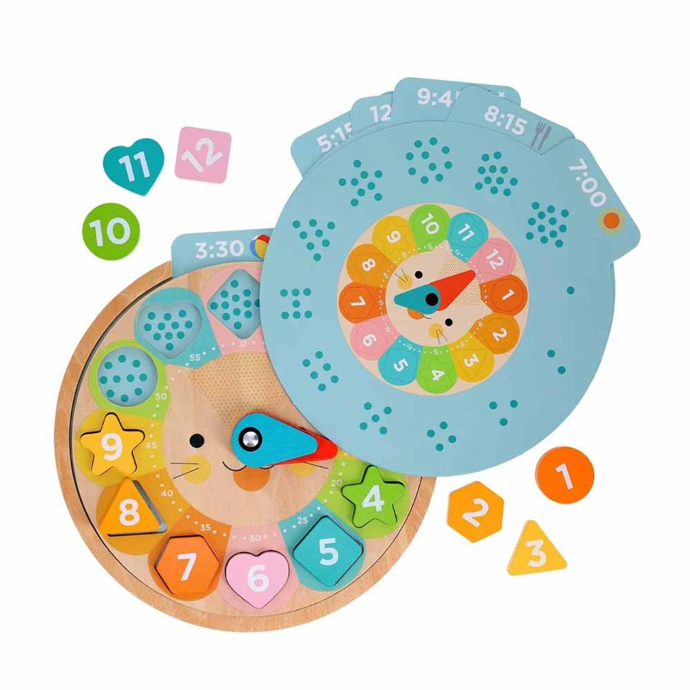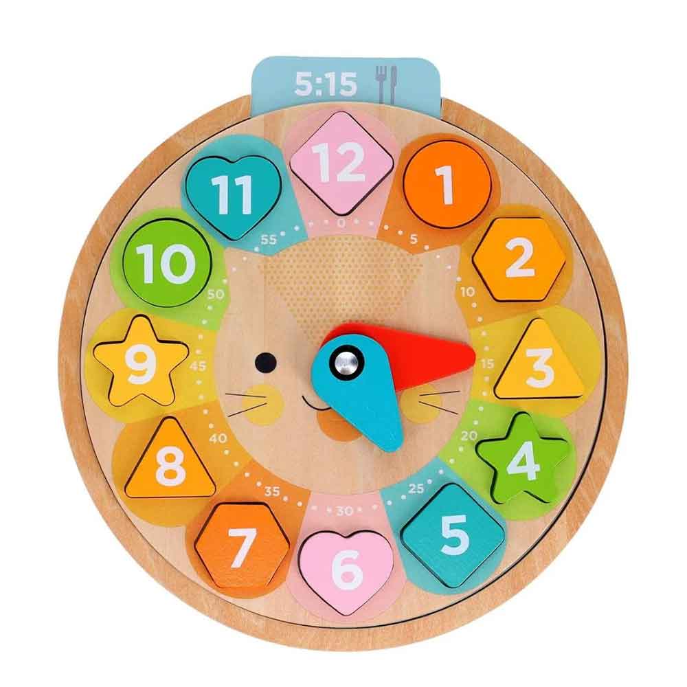 Apprenez à dire l’heure, à compter et à reconnaître les couleurs, les formes et les chiffres en six langues avec cette horloge lionne conviviale.