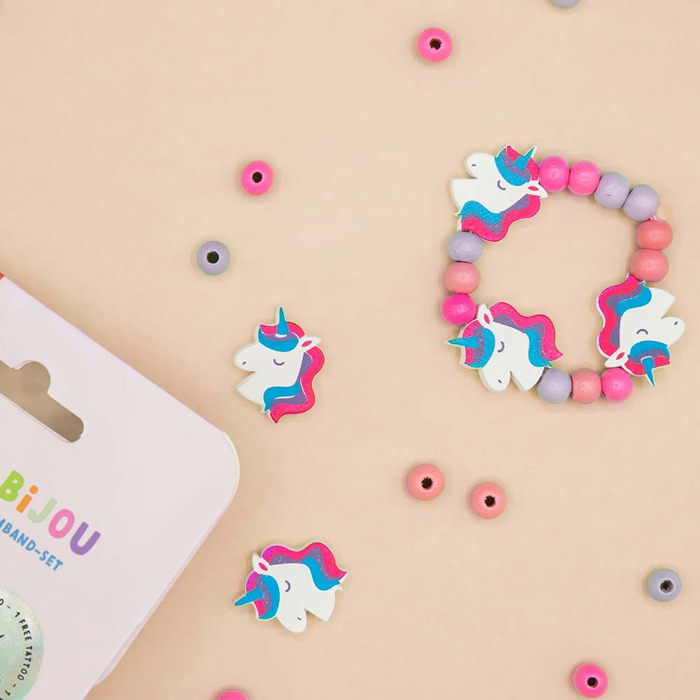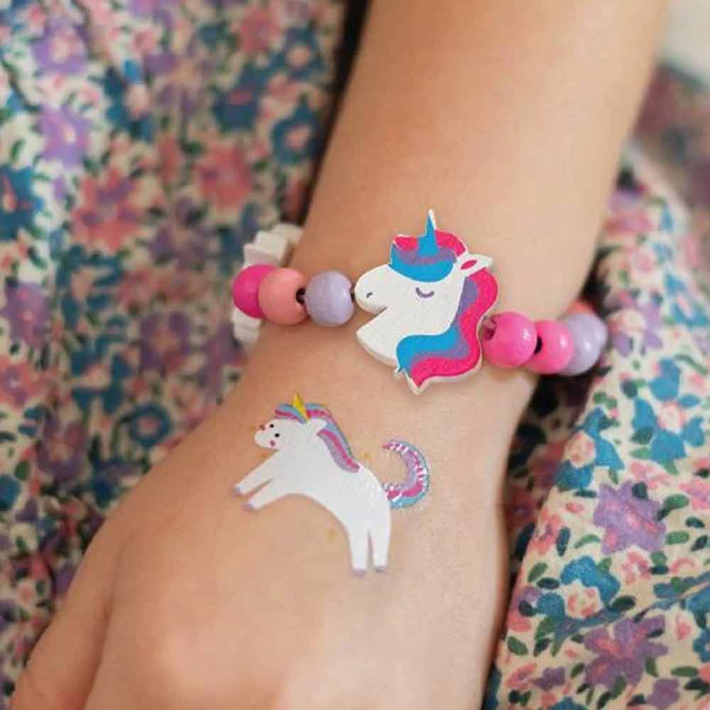 Kit bijou licorne pour confectionner un magnifique bracelet avec des perles en bois colorées et des perles en forme de licornes. En prime, un joli tatouage lui est offert pour aller avec son tout nouveau bracelet !