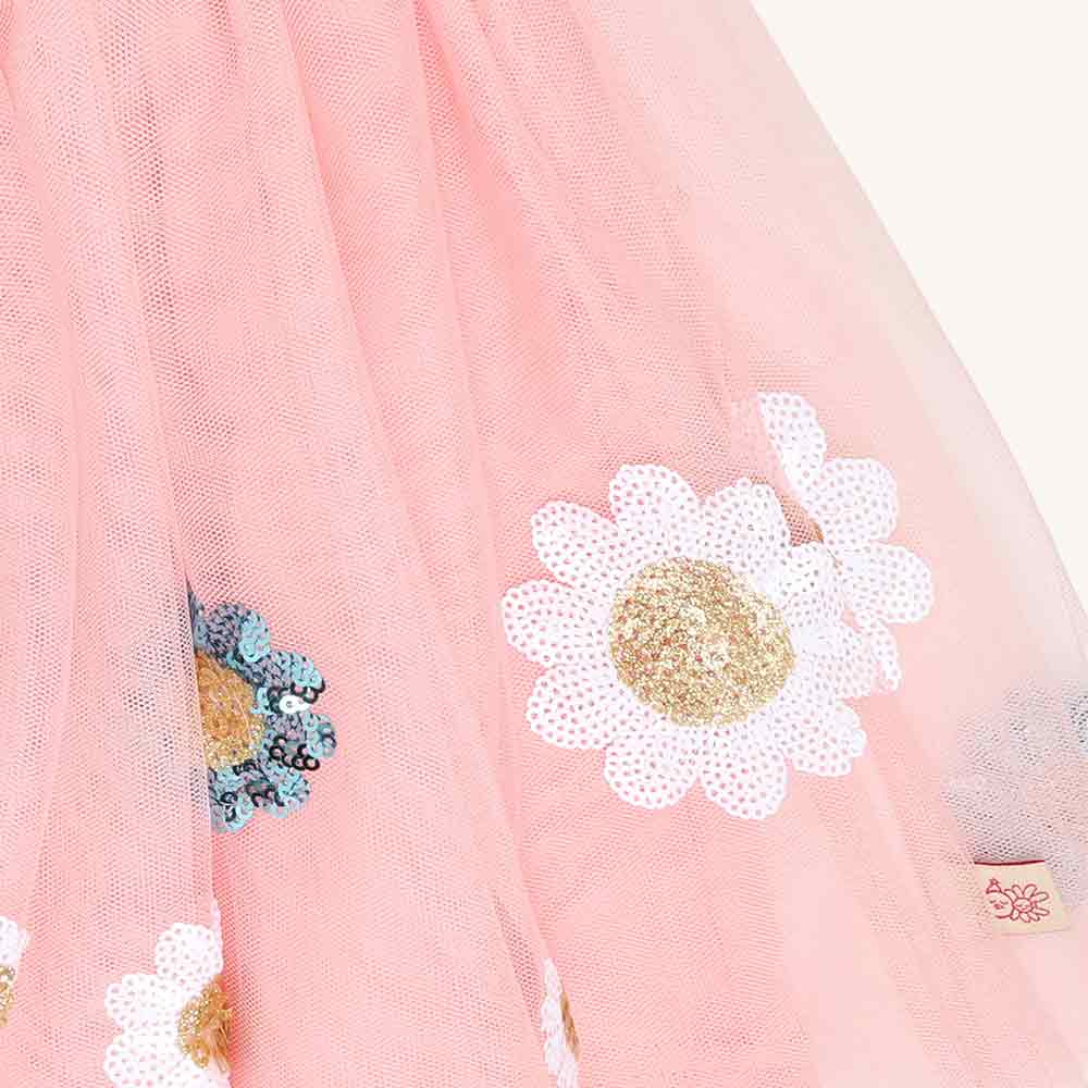 La jupe a une fine couche de tulle avec des imprimés floraux de différentes couleurs. Les fleurs sont à paillettes, ce qui donne un beau jeu.