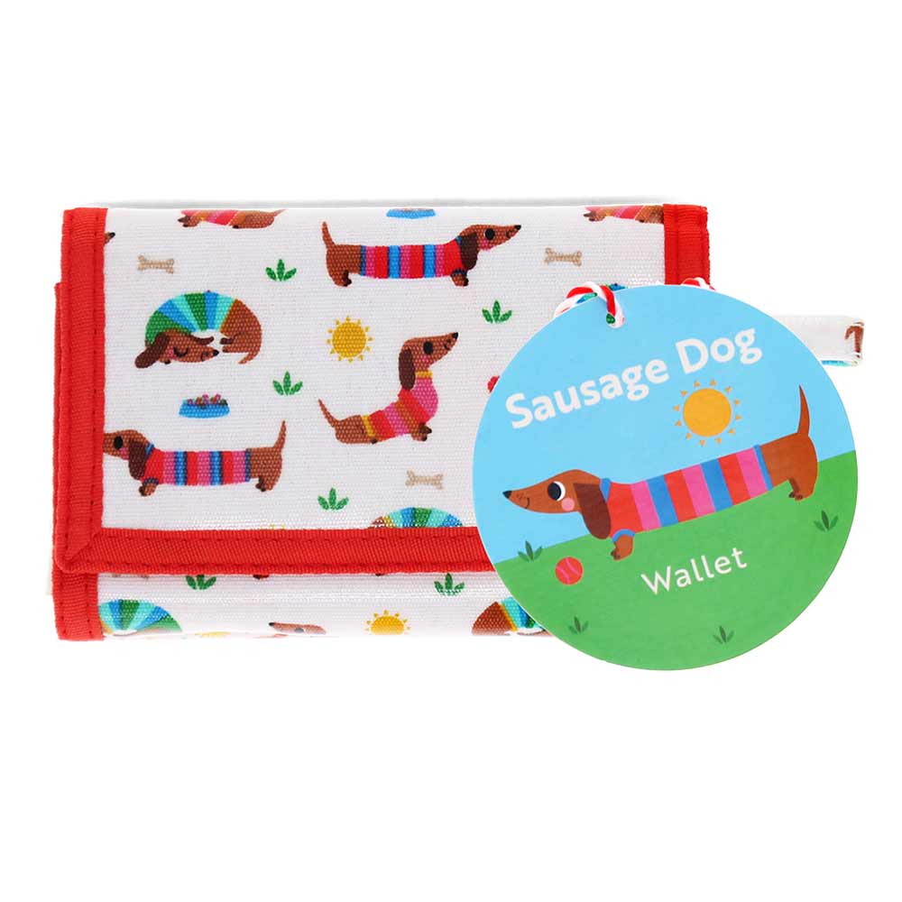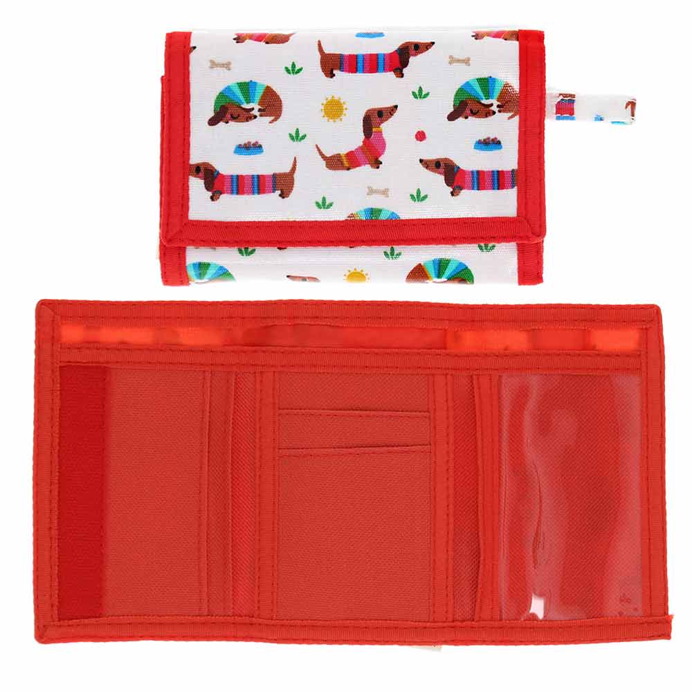 Portefeuille enfant à trois volets blanc et rouge, orné de adorables teckels au soleil.
