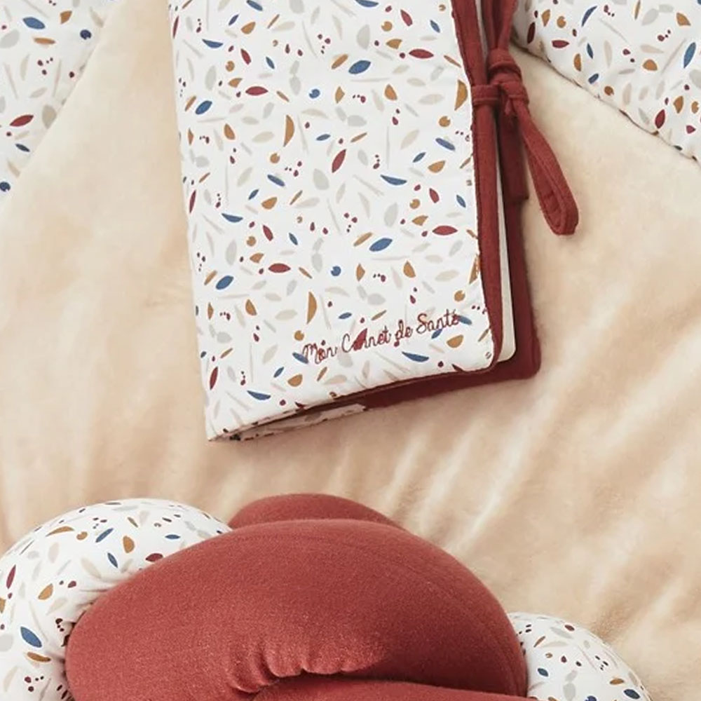 Un protège carnet de santé joli et pratique en pur coton, légèrement rembourré. Rabats à l’intérieur et liens à nouer sur le côté. Broderie Mon carnet de santé sur le devant.