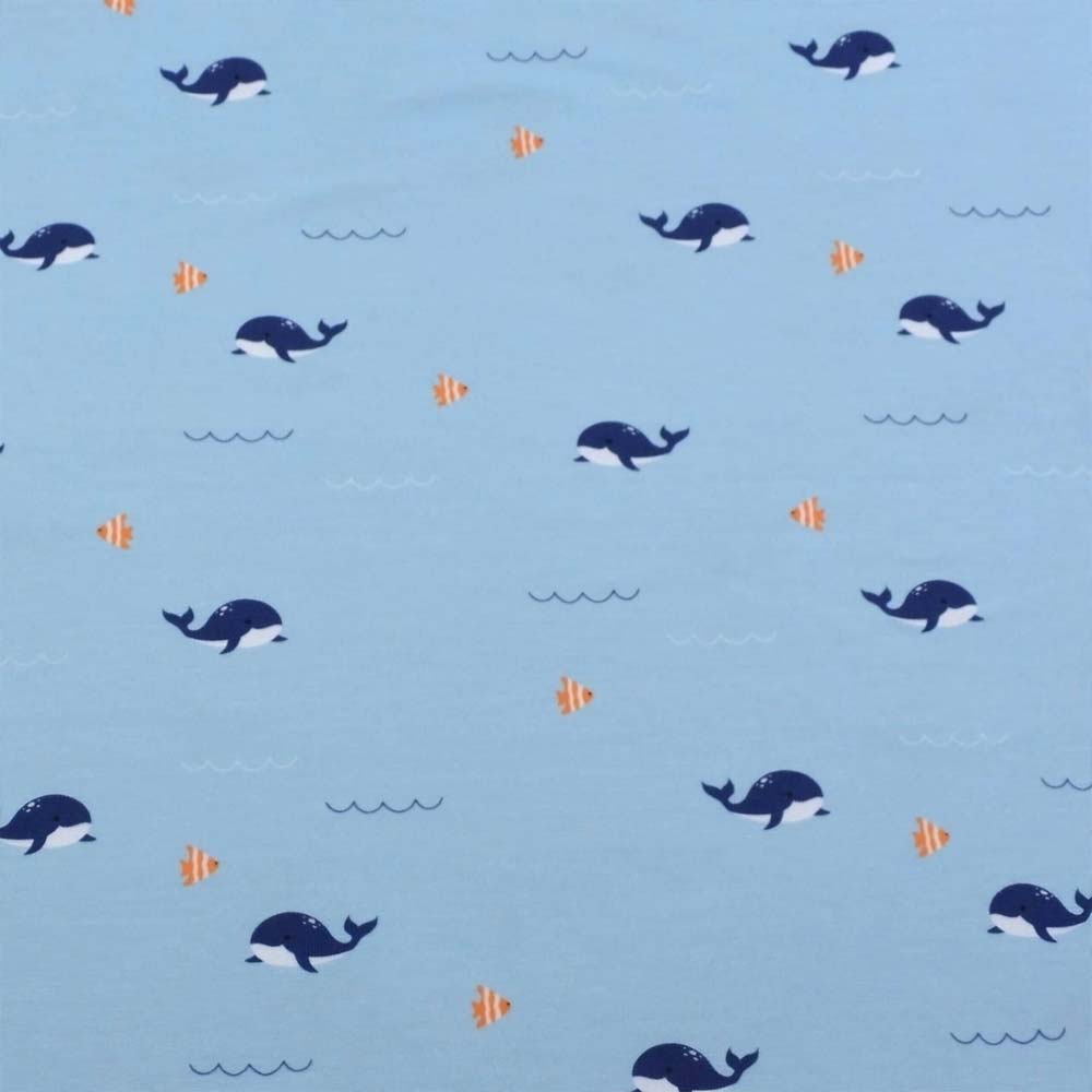 Les pulls sont pensés pour durer et s’adapter à la croissance des enfants. À nouveau un jersey, mais avec un motif baleines tout en douceur. Idéal pour les journées printanières, il s’associe aux sarouels vert pastel pour un ensemble tout en tendresse.