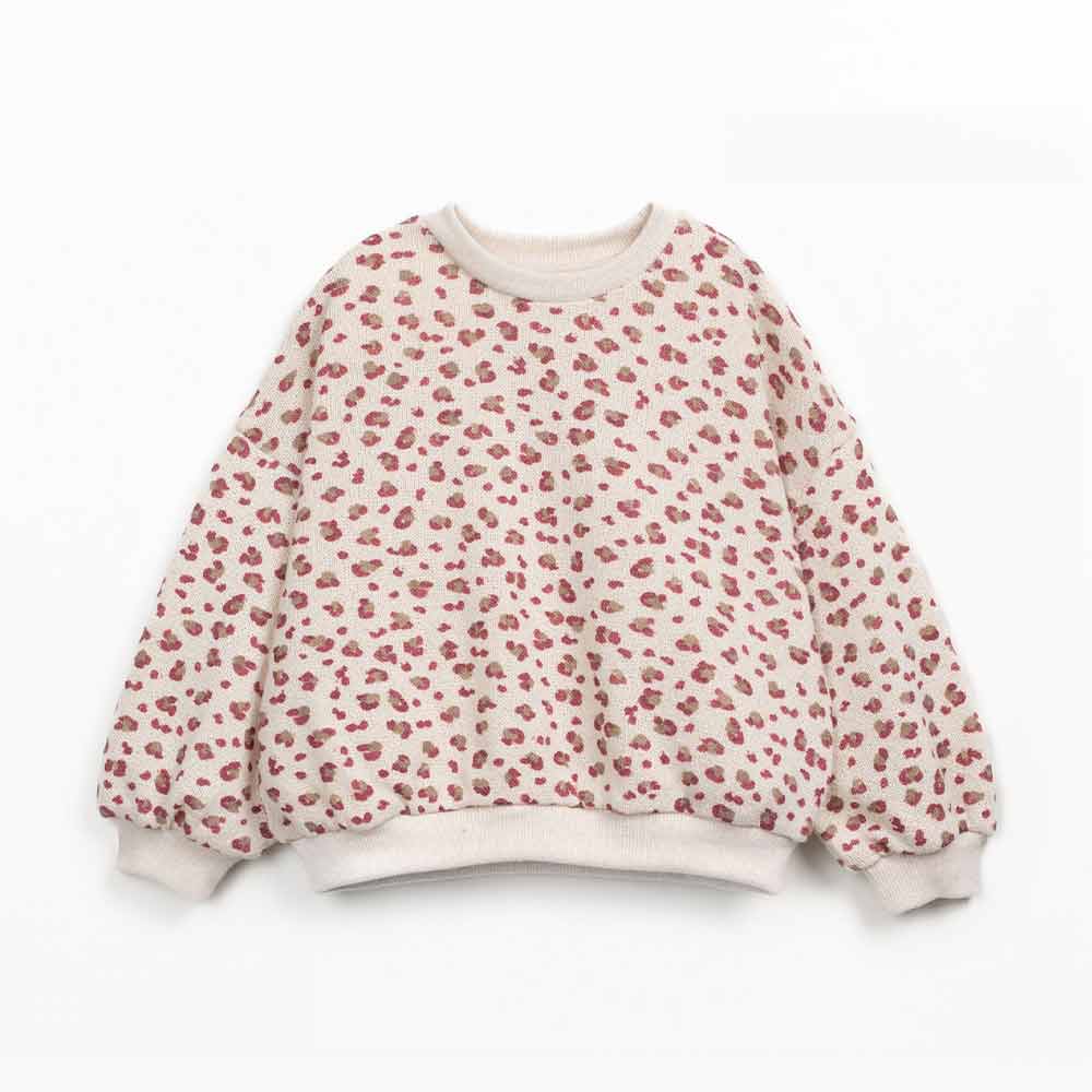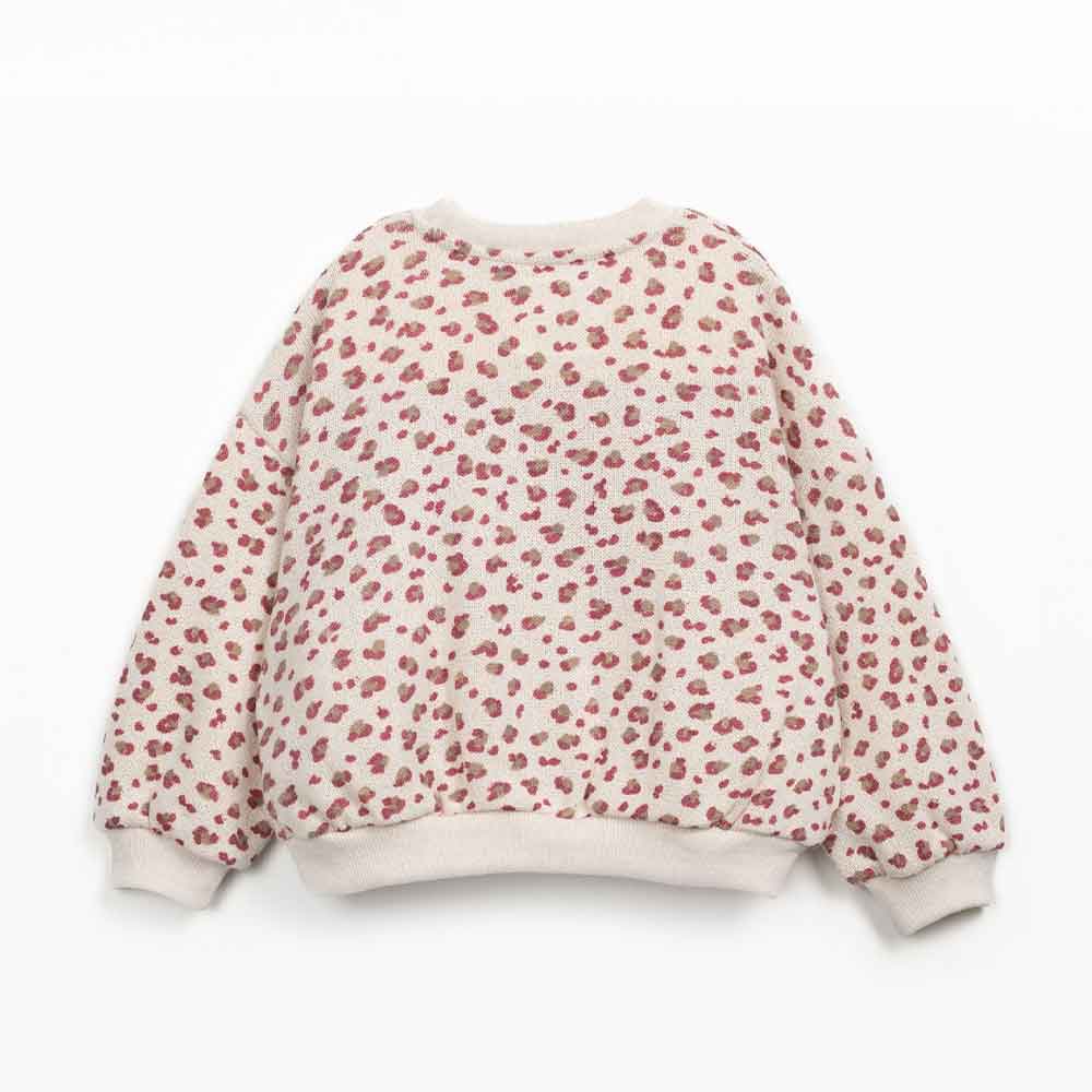 Ce sweat est en maille avec un mélange de coton régénératif et de coton recyclé, en couleur blanc cassé. Il présente une encolure ronde, des poignets et une ceinture élastiques ainsi que notre imprimé taches animales.