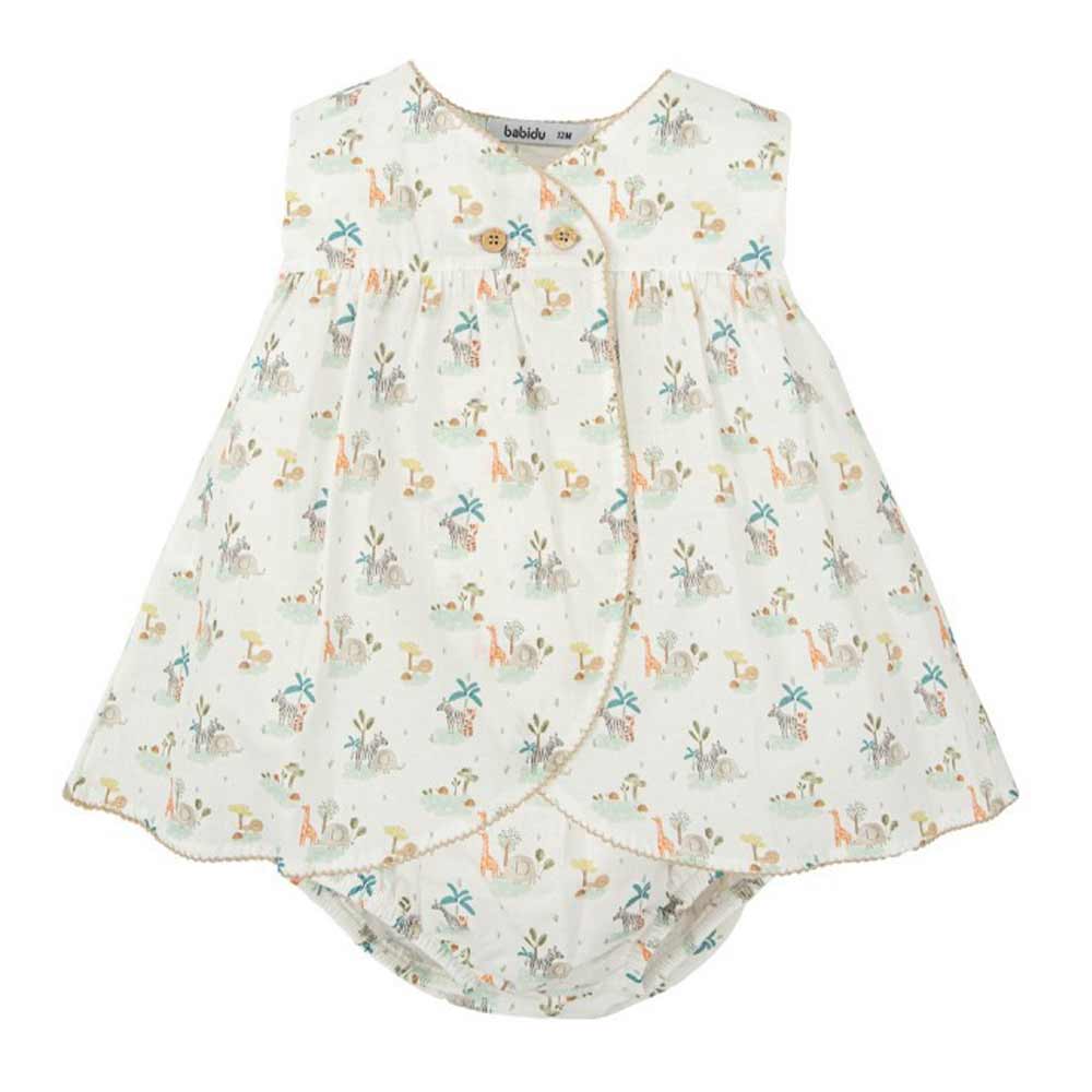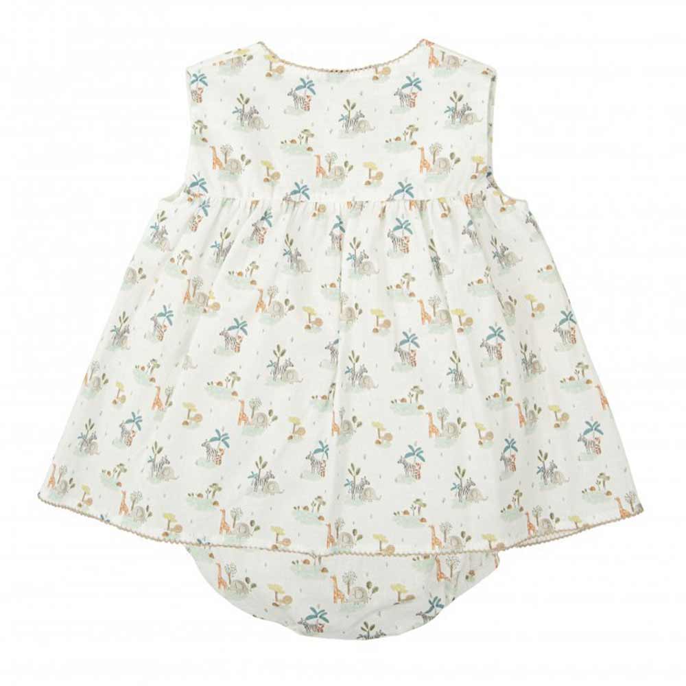 Ensemble bébé composé d’une robe avec un charmant imprimé safari et une culotte assortie. Un design frais et doux, idéal pour les journées d’été. La robe présente une coupe ample avec des fronces douces qui apportent du volume et du mouvement. Les boutons décoratifs sur le devant et l’imprimé joyeux d’animaux et de palmiers lui donnent une touche amusante et originale.