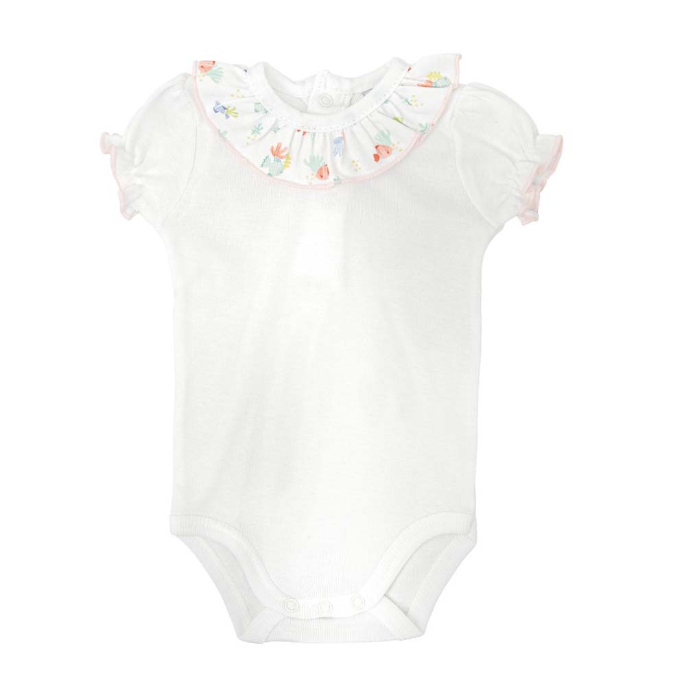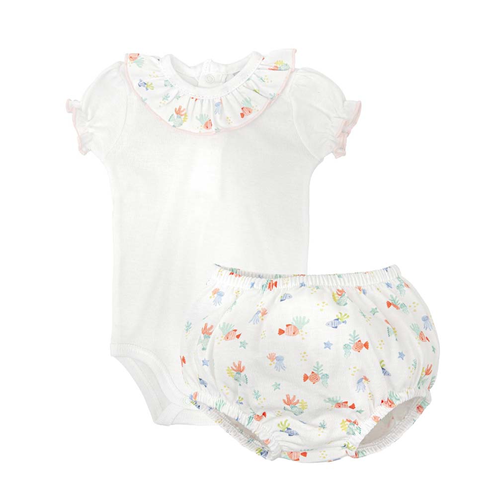 Ensemble pour bébé composé d’un body et d’une housse de couches, conçu pour allier confort et douceur les jours les plus chauds. Le body, de couleur blanche, se distingue par son col volant à imprimé mer et ses délicates finitions ondulées sur les manches, apportant une touche romantique et élégante. L’ensemble est complété par une housse de couche assortie en tissu imprimé mer, avec une taille et des jambes élastiques pour un ajustement confortable et délicat.