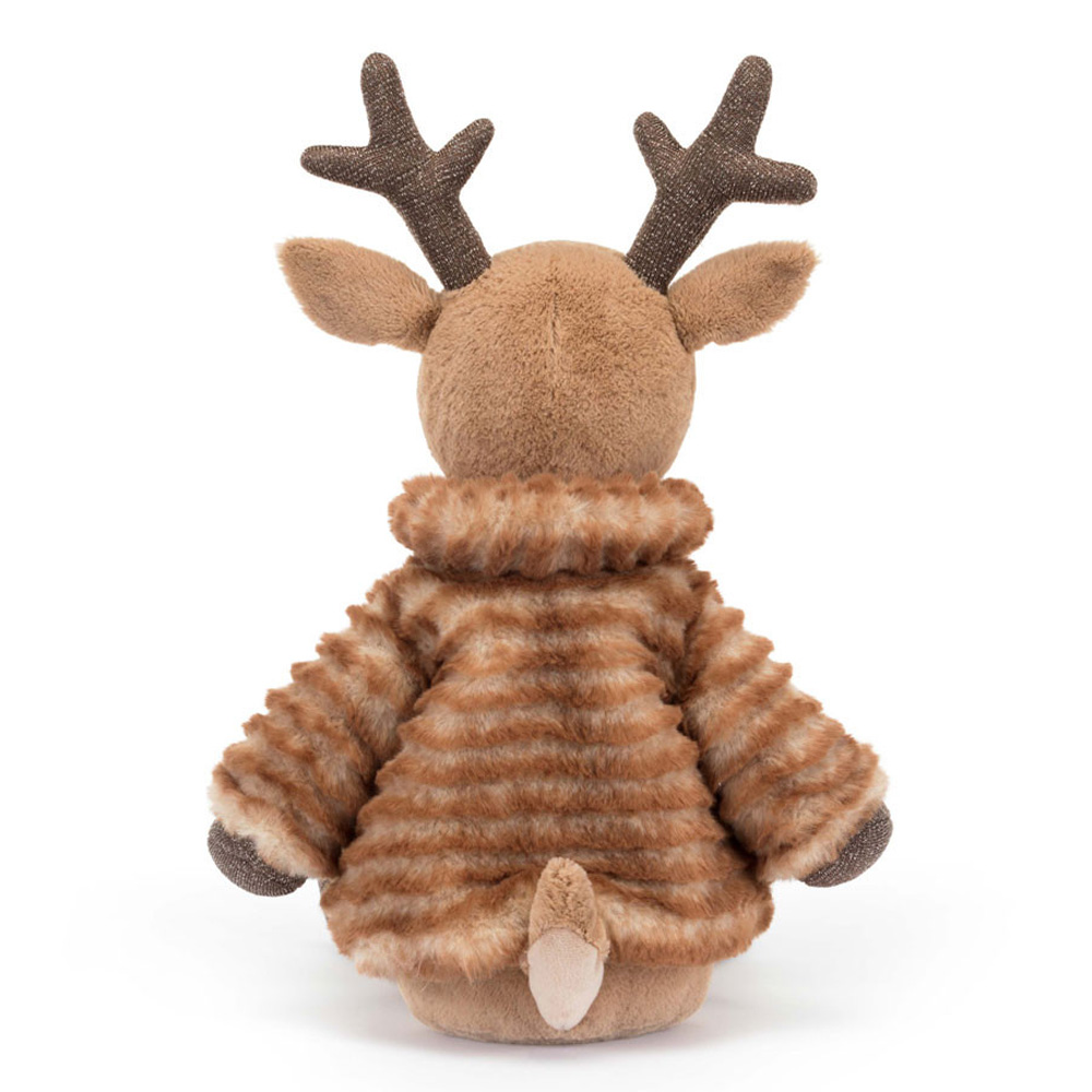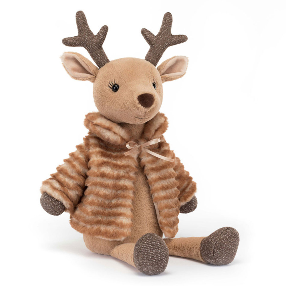 Annonce du divin renne de Sofia ! Ce cerf glamour est la quintessence du chic de Noël. Sofia porte un manteau moelleux à rayures crème-caramel, avec une cravate en ruban et une doublure champagne. Il va parfaitement avec son nez en chocolat noir, ses cils brodés et ses sabots et ses bois scintillants.