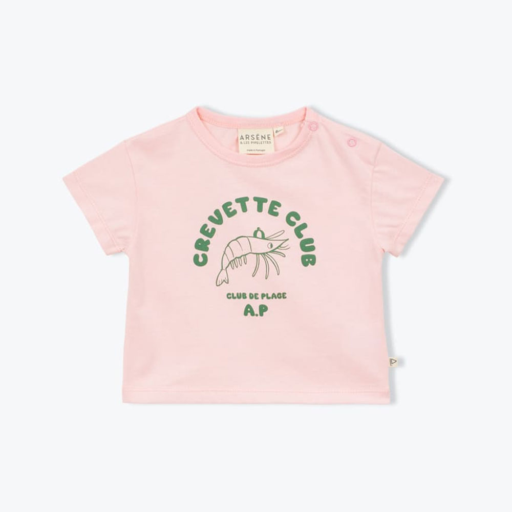 T-shirt bébé « Crevette Club » rose poudré, doux et confortable pour accompagner les tout-petits au quotidien. Confectionné en jersey 100 % coton biologique tricoté, il respecte la peau délicate des bébés.