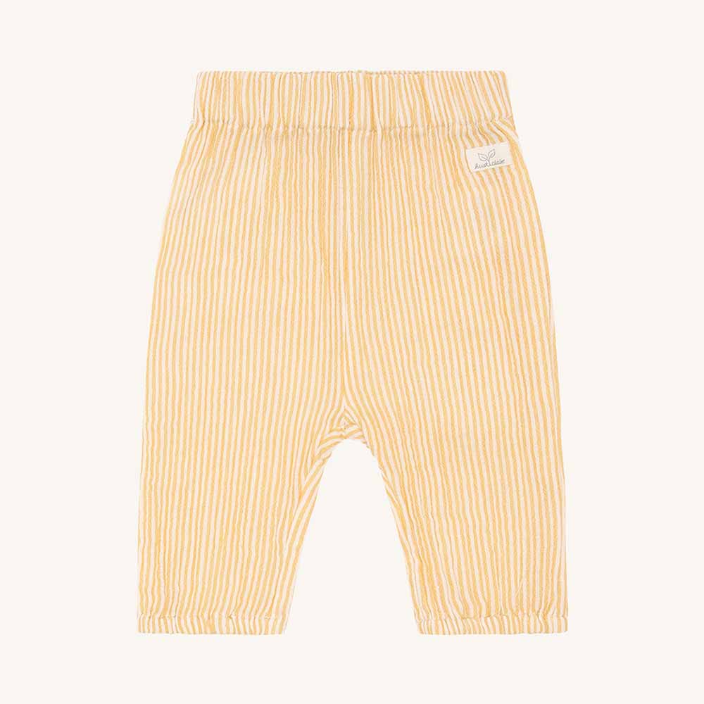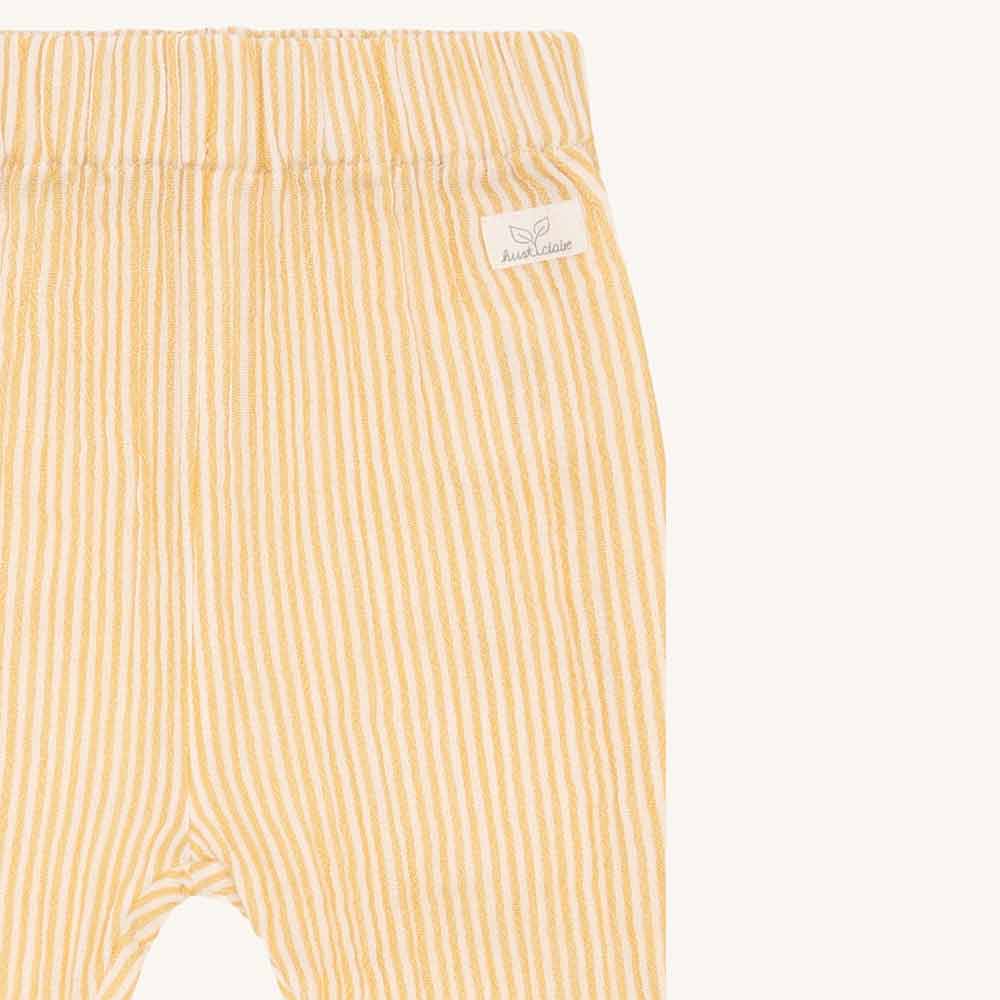 Ce pantalon bébé de Hust&Claire apporte immédiatement de la bonne humeur à la tenue avec ses fines rayures jaunes et blanches. Frais et léger le coton doux est agréable sur la peau et offre une grande liberté de mouvement pour piétiner, ramper et découvrir. La ceinture élastique assure un ajustement confortable sans appuyer, idéal pour la vie quotidienne avec bébé.